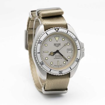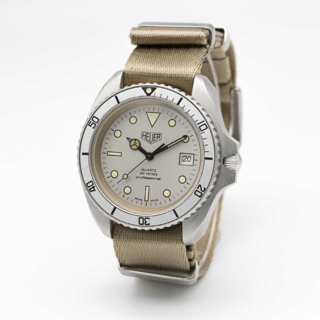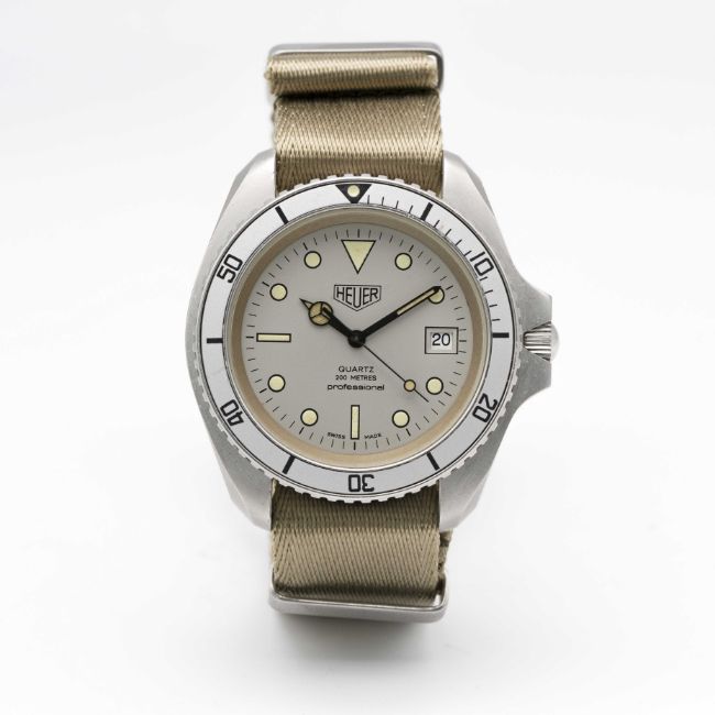 A RARE GENTLEMAN'S STAINLESS STEEL PEWTER PVD COATED HEUER PROFESSIONAL 200 METRES QUARTZ DIVERS WRIST WATCHCIRCA 1980s, REF. 982.006  Movement: Quartz, ESA calibre, signed Heuer.Case: Diameter approx. 42mm, screw back, signed Heuer-Leonidas S.A and M.R.P. S.A., numbered, 60 minute rotating bezel, unsigned screw-down crown.Strap: NATO.CONDITION REPORTDial: Original dial in excellent condition.Movement: Running & functioning at present, timekeeping and accuracy cannot be guaranteed.Case: In good condition, with some small scratches and light wear due to general use.Strap: In excellent condition.