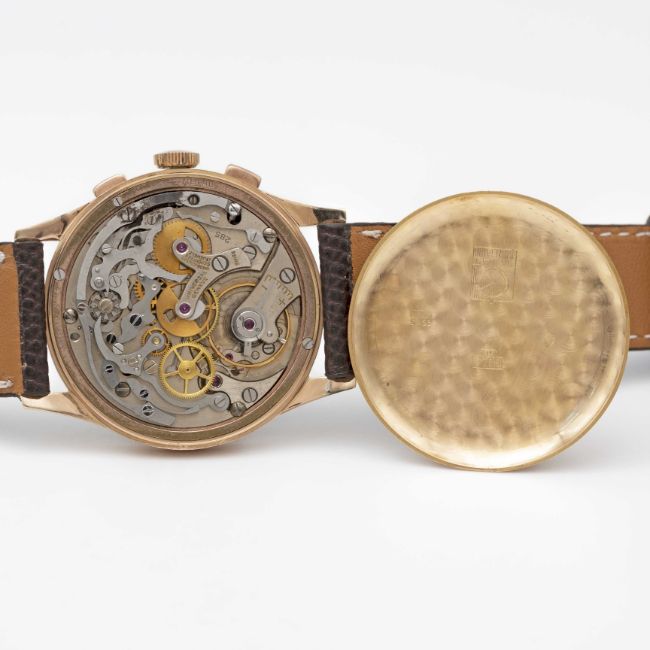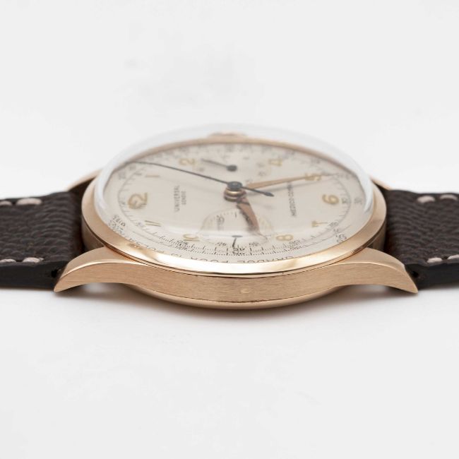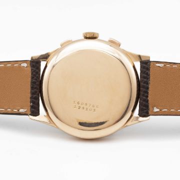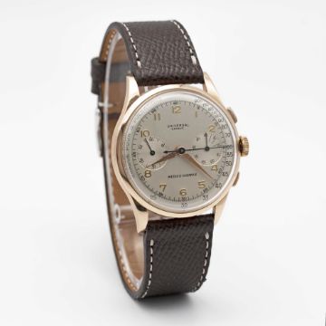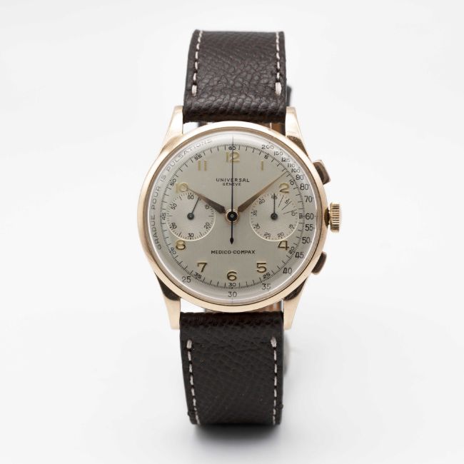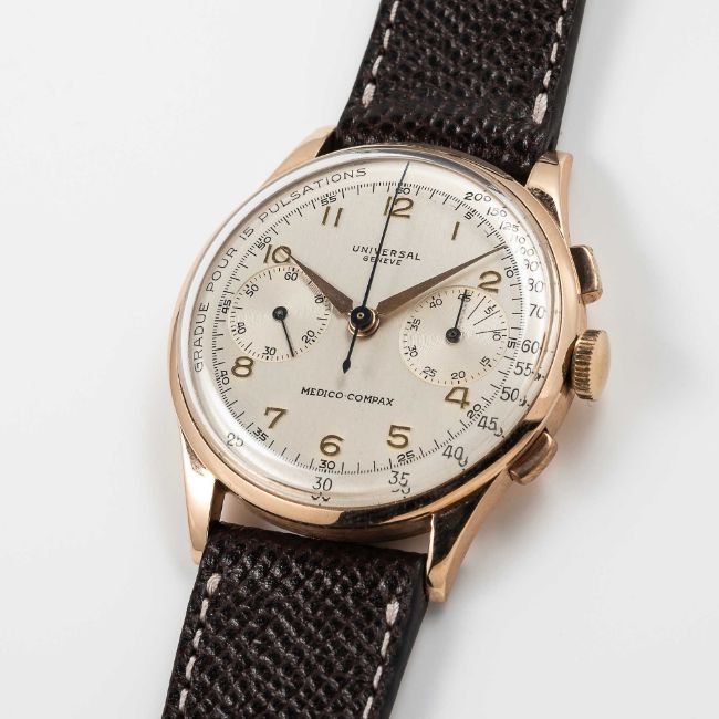 A RARE GENTLEMAN'S LARGE SIZE 18K SOLID ROSE GOLD UNIVERSAL GENEVE MEDICO COMPAX CHRONOGRAPH WRIST WATCHCIRCA 1950s, REF. 124103 WITH PULSATIONS SCALE DIALMovement: 17J, manual wind, cal. 285, signed Universal Geneve.Case: Diameter approx. 37.5mm, snap back, signed Universal Geneve, numbered 1,6xx,xxx, 18k hallmarks.Strap: Leather.CONDITION REPORTDial: Original dial in excellent condition, some small signs of age.Movement: Running & functioning at present, timekeeping and accuracy cannot be guaranteed.Case: In very good condition, with some wear due to general use, gold plating worn on top pusher.Strap/Bracelet: In excellent condition.