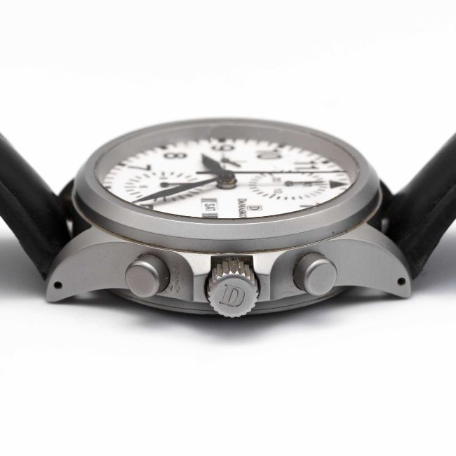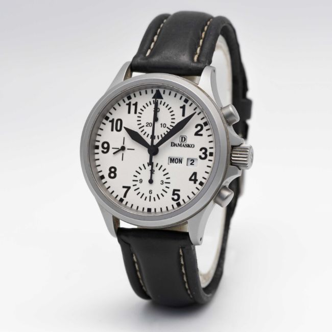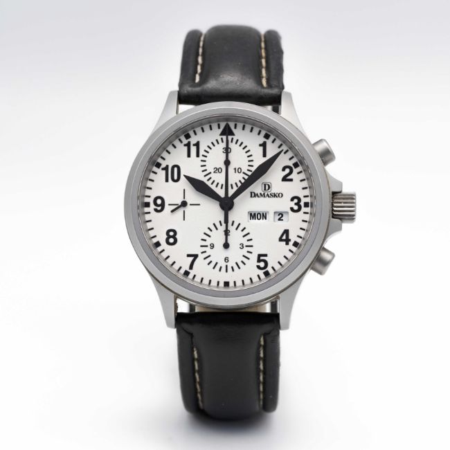 A GENTLEMAN'S STAINLESS STEEL DAMASKO AUTOMATIC CHRONOGRAPH WRIST WATCH CIRCA 2000s, REF. DC57 WITH FULLY LUMINOUS DIAL Movement: 25J, automatic, Valjoux cal. 7750.Case: Diameter approx. 40mm, matte finish, screw back, signed & numbered, Damasko screw-down crown.Strap: Leather strap with original Damasko pin buckle.  CONDITION REPORTDial: Original dial in excellent condition. Movement: Running & functioning at present, timekeeping and accuracy cannot be guaranteed. Case: In very good condition, with some light scratches & dirt due to general use. Strap: In poor condition.