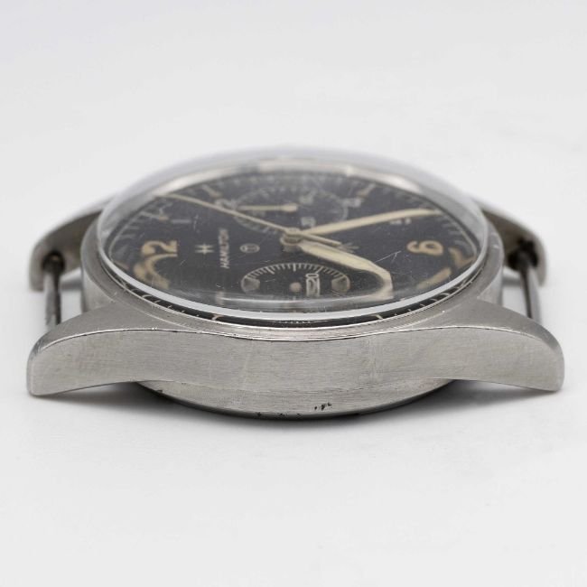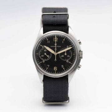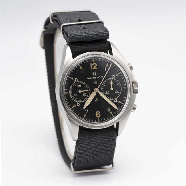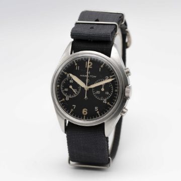 A GENTLEMAN'S STAINLESS STEEL BRITISH MILITARY ROYAL NAVY HAMILTON PILOTS CHRONOGRAPH WRIST WATCHDATED 1970, PART OF THE "FAB FOUR"Movement: 17J, manual wind, Valjoux cal. 7733, signed Hamilton.Case: Diameter approx. 39mm, fixed bars, screw back, numbered, issue markings 0552/924-3306 ^ 721/70. Strap: NATO.CONDITION REPORTDial: Original dial in excellent condition, showing some small signs of age.Movement: Running & functioning at present, timekeeping and accuracy cannot be guaranteed.Case: In excellent condition, with some small scratches due to use.Strap/Bracelet: In very good condition.