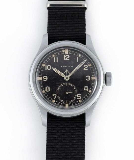 A GENTLEMAN'S STAINLESS STEEL BRITISH MILITARY TIMOR W.W.W. WRIST WATCHCIRCA 1945, PART OF THE "DIRTY DOZEN"  WITH LOW ISSUE NUMBERMovement: 15J, manual wind, cal. 6060, signed Timor.Case: Diameter approx. 36mm, fixed bars, screw back, issue markings TIMOR ^ W.W.W. K 164 30064, dust cover.Strap: NATO.CONDITION REPORTDial: Original dial in good condition, showing signs of age.Movement: Running & functioning at present, timekeeping and accuracy cannot be guaranteed.Case: In very good condition, with some light scratches due to use.Strap/Bracelet: In excellent condition.