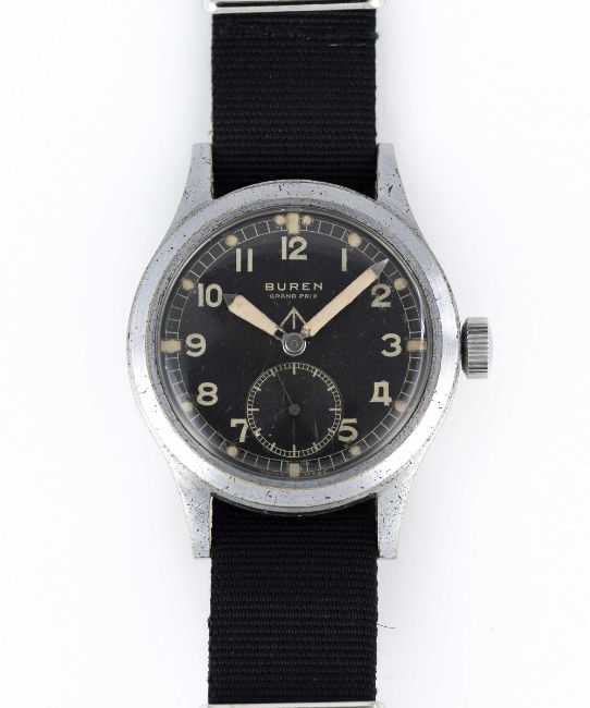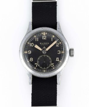 A GENTLEMAN'S BRITISH MILITARY BUREN GRAND PRIX W.W.W. WRIST WATCHCIRCA 1945, PART OF THE "DIRTY DOZEN"Movement: 15J, manual wind, signed Buren Grand Prix Case: Diameter approx. 36mm, fixed bars, nickel plated case with steel screw back, issue markings, dust cover.Strap: NATO.CONDITION REPORTDial: Original dial in good condition, showing some signs of age.Movement: Running & functioning at present, timekeeping and accuracy cannot be guaranteed.Case: In good condition, with small scratches and wear due to use.Strap: In excellent condition.