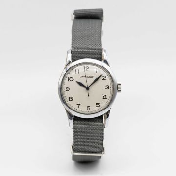 A GENTLEMAN'S BRITISH MILITARY JAEGER LECOULTRE RAF PILOTS WRIST WATCHCIRCA 1940, WITH WHITE MOD DIALMovement: Manual wind, cal. 470/1, signed Jaeger-LeCoultre, numbered.Case: Diameter approx. 32mm, fixed bars, nickel plated top with stainless steel snap back, numbered, issue markings ^ 6B/159 A23871. Strap: NATO.CONDITION REPORTDial: Original MOD dial in very good condition, showing some small signs of age. Movement: Running & functioning at present, timekeeping and accuracy cannot be guaranteed.Case: In good condition, with some light scratches and wear due to use.Strap: In excellent condition.