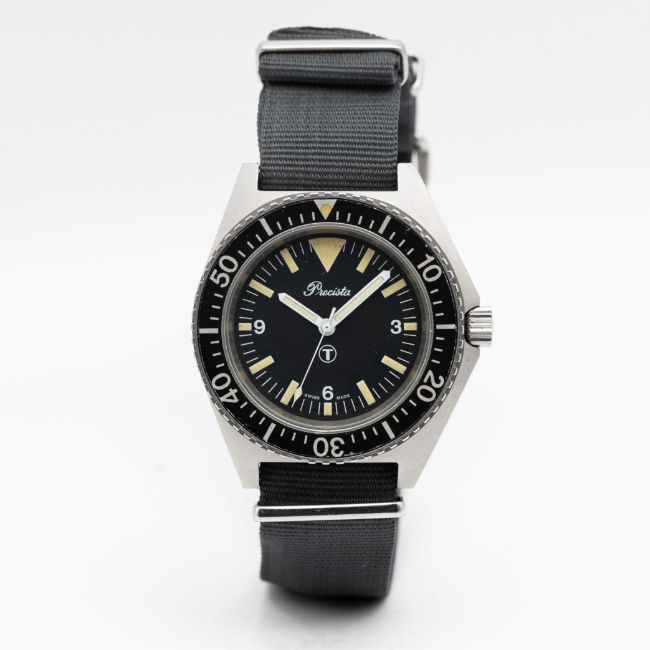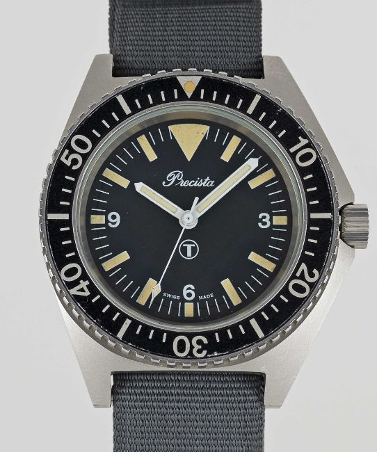 A RARE GENTLEMAN'S STAINLESS STEEL BRITISH MILITARY PRECISTA ROYAL NAVY DIVERS WRIST WATCHDATED 1993, WITH "BIG TRIANGLE" TRITIUM DIALMovement: Quartz.Case: Diameter approx. 41mm, asymmetric, fixed bars, screw back, issue markings 6645-99-757-3314 112/93 ^, 60 minute rotating bezel, screw-down crown.Strap: NATO.CONDITION REPORTDial: Original dial in excellent condition.Movement: Running & functioning at present, timekeeping and accuracy cannot be guaranteed.Case: In excellent condition.Strap: In excellent condition.
