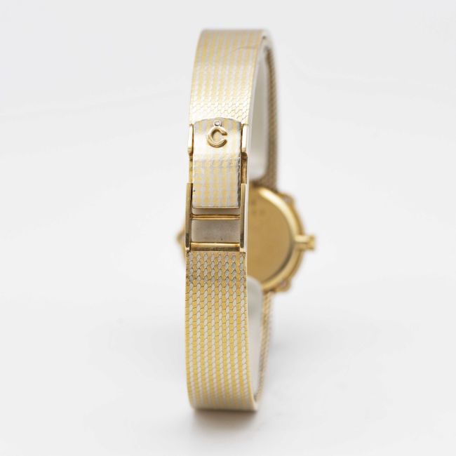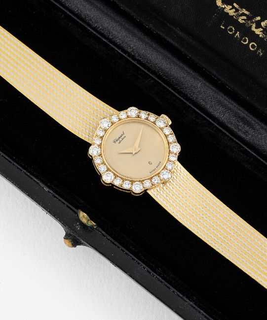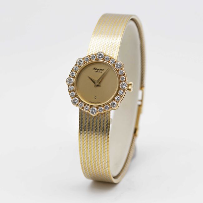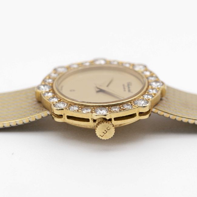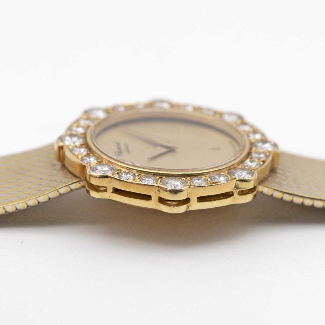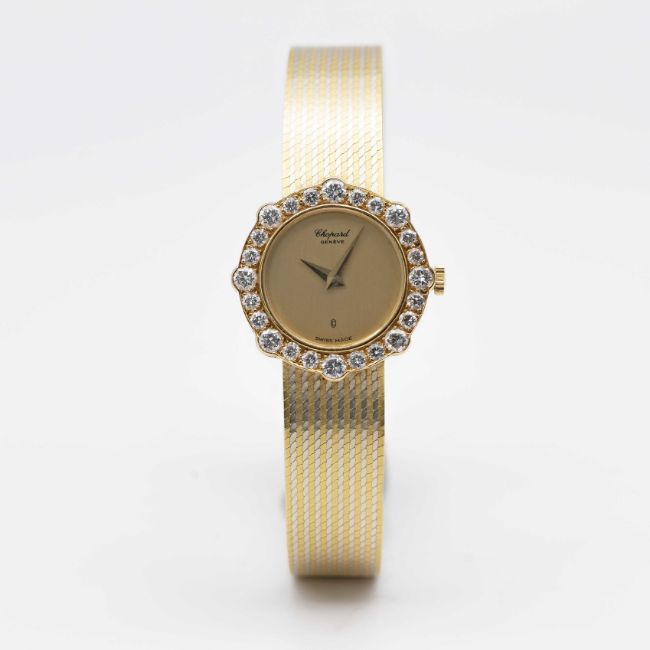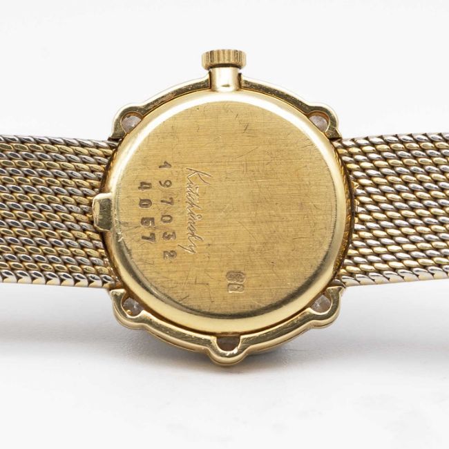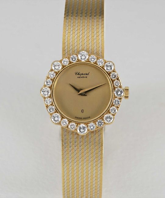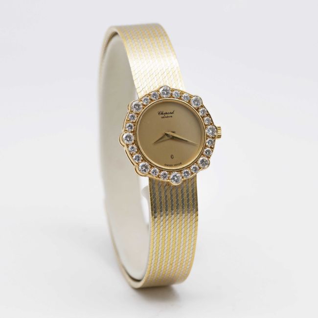A FINE LADIES 18K SOLID YELLOW & WHITE GOLD DIAMOND CHOPARD BRACELET WATCHCIRCA 1980s, REF. 4057 ORIGINALLY RETAILED BY KUTCHINSKY LONDON, ACCOMPANIED BY ITS ORIGINAL BOXMovement: Quartz, signed Chopard.Case: Diameter approx. 22mm, signed Chopard and Kutchinsky, original diamond set case, numbered, 18k hallmarks, Chopard crown.Bracelet: Original 18k yellow & white gold bracelet, signed Chopard, 18k hallmarks & numbered.CONDITION REPORTDial: Original dial in excellent condition.Movement: Running & functioning at present, timekeeping and accuracy cannot be guaranteed.Case: In excellent condition, with some light scratches due to general use.Strap/Bracelet: In excellent condition.