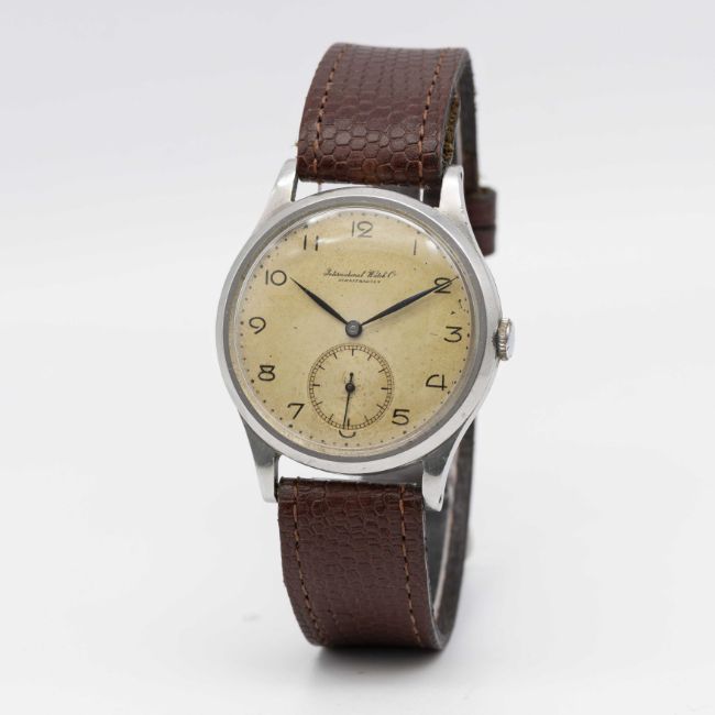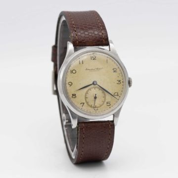 A GENTLEMAN'S STAINLESS STEEL IWC WRIST WATCHCIRCA 1940s, WITH CAL. 83 MOVEMENTMovement: Manual wind, cal. 83, signed International Watch Co, numbered.Case: Diameter approx. 35mm, snap back, signed IWC, numbered.Strap: Leather.CONDITION REPORTDial: Original dial in good condition, showing some signs of age.Movement: Running & functioning at present, timekeeping and accuracy cannot be guaranteed.Case: In very good condition, with some scratches due to general use.Strap: In excellent condition.