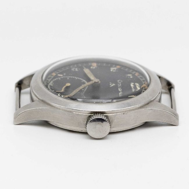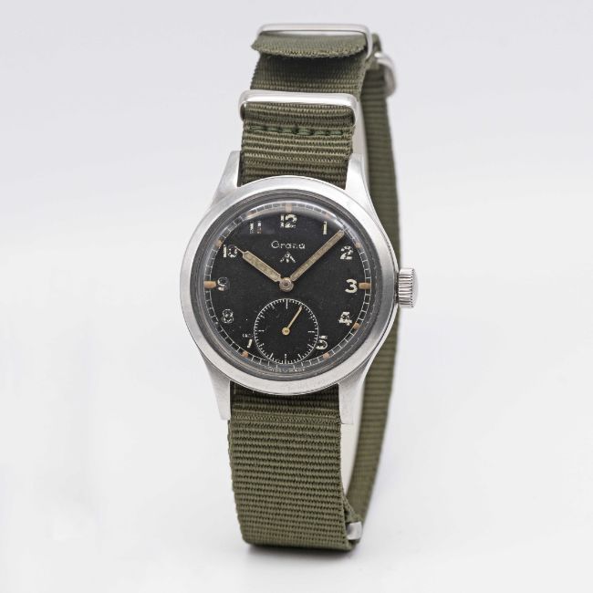 A RARE GENTLEMAN'S STAINLESS STEEL BRITISH MILITARY GRANA W.W.W. WRIST WATCHCIRCA 1945, THE RAREST OF THE "DIRTY DOZEN", HAVING BEEN ORDERED BY THE MOD IN THE FEWEST NUMBERS (APPROX. 1000-1500) OUT OF THE TWELVE BRANDS CONTRACTEDMovement: 15J, manual wind, cal. K.F.320.Case: Diameter approx. 36mm, fixed bars, screw back, numbered 55x,xxx to inside case back, issue markings ^ W.W.W. M 18478, dust cover.Strap: NATO.CONDITION REPORTDial: Original dial in fair condition, showing signs of age, MoD hands.Movement: Running & functioning at present, timekeeping and accuracy cannot be guaranteed.Case: In excellent condition, with some light scratches due to use.Strap: In excellent condition.