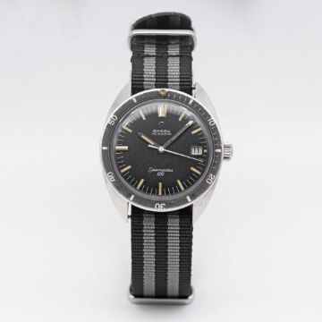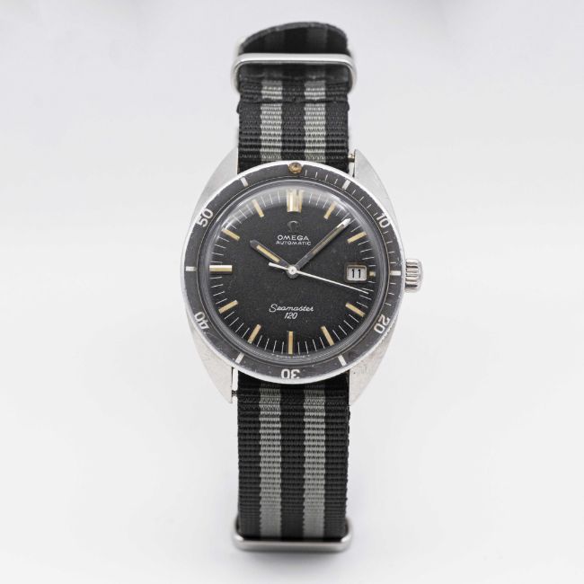 A GENTLEMAN'S STAINLESS STEEL OMEGA SEAMASTER 120 AUTOMATIC DATE WRIST WATCHCIRCA 1968, REF. 166.027 Movement: 24J, automatic, cal. 565, signed Omega Watch Co, numbered 26,xxx,xxx. Case: Width approx. 37mm, screw back, Seamaster emblem on case back, signed Omega Watch Co, 60 minute rotating bezel faded to grey, Omega crown.Strap: NATO.CONDITION REPORTDial: Original dial in very good condition.Movement: Running & functioning at present, timekeeping and accuracy cannot be guaranteed.Case: In good condition, with some light scratches and light wear due to general use.Strap: In excellent condition.
