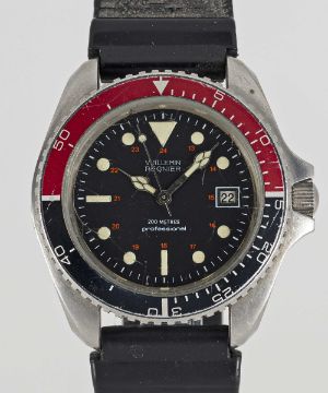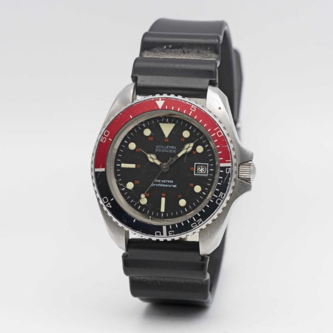 A RARE GENTLEMAN'S STAINLESS STEEL VUILLEMIN REGNIER 200 METRES PROFESSIONEL AUTOMATIC DIVERS WRIST WATCHCIRCA 1979, REF. 844 WITH 24 HOUR DIAL & CATHEDRAL HANDSMovement: Automatic, cal. FE 4611A.Case: Diameter approx. 42mm, screw back, ref. 503.305, signed M.R.P. S.A., numbered, 60 minute rotating bezel, screw-down crown.Strap: Rubber.CONDITION REPORTDial: Original dial in excellent condition.Movement: Running & functioning at present, timekeeping and accuracy cannot be guaranteed.Case: In very good condition, with scratches due to general use.Strap: In good condition.
