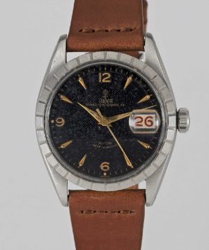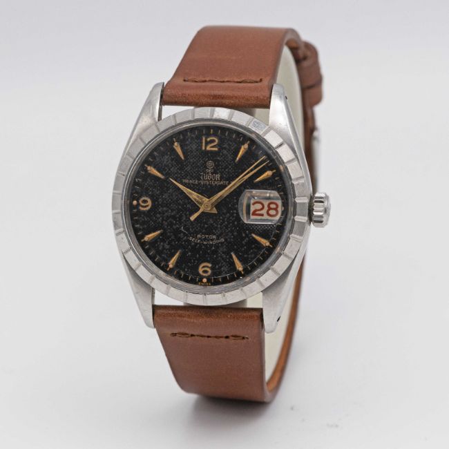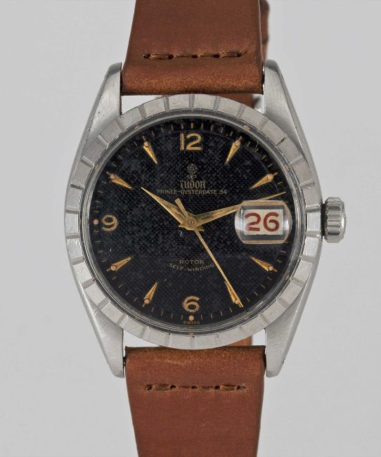 A GENTLEMAN'S STAINLESS STEEL ROLEX TUDOR OYSTERDATE 34 WRIST WATCHCIRCA 1959, REF. 7944 WITH GLOSS BLACK "HONEYCOMB" DIAL & "ROULETTE" DATEMovement: 17J, automatic, "butterfly" rotor, signed Tudor Auto-Prince.Case: Diameter approx. 34.5mm, Oyster case, signed Montres Tudor S.A., dated I.59, Rolex crown.Strap: Leather.CONDITION REPORTDial: Original dial in good condition, showing some signs of age.Movement: Running & functioning at present, timekeeping and accuracy cannot be guaranteed.Case: In very good condition, with scratches due to general use.Strap: In excellent condition.