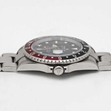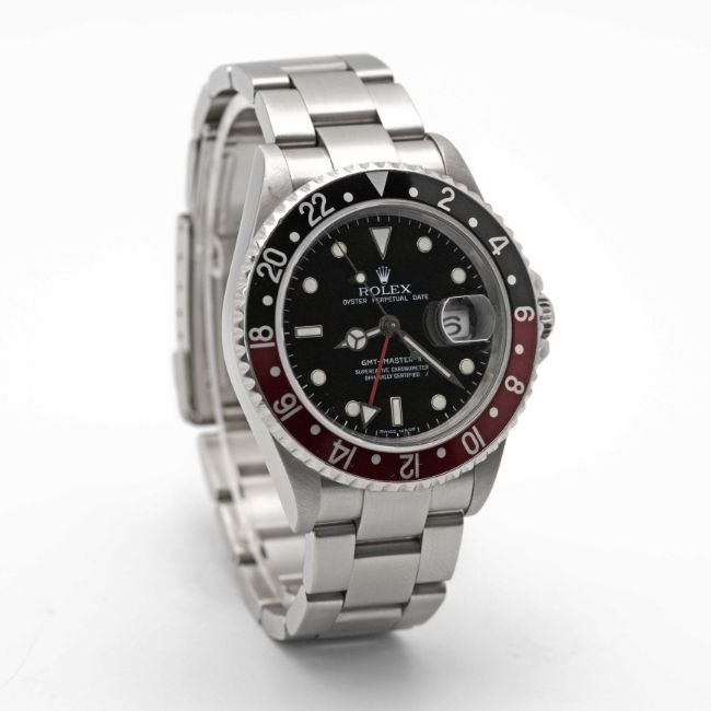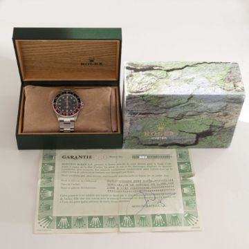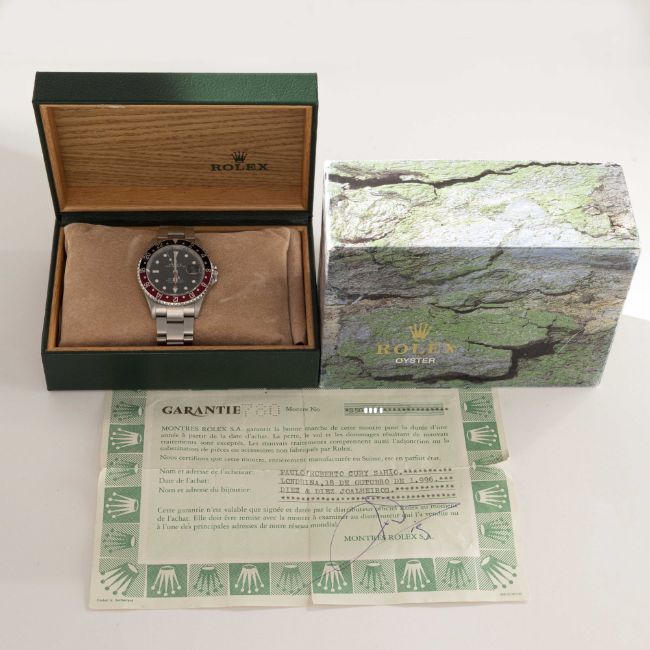 A GENTLEMAN'S STAINLESS STEEL ROLEX OYSTER PERPETUAL GMT MASTER II "COKE" BRACELET WATCHDATED 1996, REF. 16710 WITH LATER "STICK DIAL", ACCOMPANIED BY ROLEX BOX & ORIGINAL GUARANTEE PAPERWORKMovement: 31J, automatic chronometer, quick-set date, cal. 3185, signed Montres Rolex S.A., numbered.Case: Diameter approx. 40mm, Oyster case, signed Montres Rolex S.A., S serial no., 24 hour rotating "Coke" bezel, sapphire crystal, Rolex crown.Bracelet: Rolex Oyster bracelet with flip-lock clasp, numbered FZ10/78790A/MA.CONDITION REPORTDial: Original Rolex dial from later period in excellent condition.Movement: Running & functioning at present, timekeeping and accuracy cannot be guaranteed.Case: In very good condition, with some small scratches and wear due to general use.Bracelet: In very good condition, with some light scratches.