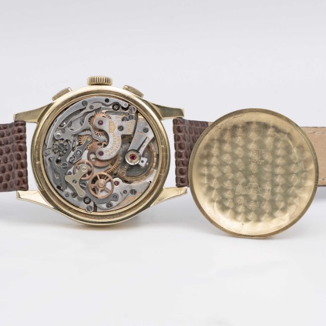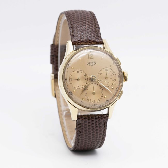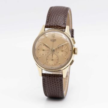 A GENTLEMAN'S 14K SOLID YELLOW GOLD HEUER CHRONOGRAPH WRIST WATCHCIRCA 1950sMovement: 17J, manual wind, valjoux cal. 72, signed Heuer, numbered.Case: Diameter approx. 35.5mm, snap back, signed Heuer, 14k hallmarks, numbered.Strap: Leather.CONDITION REPORTDial: Original dial in good condition, showing some signs of age.Movement: Running & functioning at present, timekeeping and accuracy cannot be guaranteed.Case: In excellent condition, with light scratches due to general use.Strap: In excellent condition.
