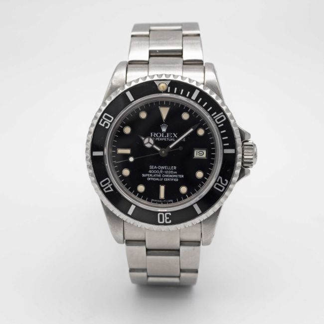 A GENTLEMAN'S STAINLESS STEEL ROLEX OYSTER PERPETUAL DATE SEA DWELLER BRACELET WATCHCIRCA 1983, REF. 16660 "TRIPLE SIX"Movement: 27J, automatic chronometer, quick-set date, cal. 3035, signed Rolex S.A., numbered.Case: Diameter approx. 40mm, Oyster case, signed Montres Rolex S.A., serial no. 7,4xx,xxx, gas escape valve, sapphire crystal, 60 minute rotating bezel, Rolex triplock crown.Bracelet: Rolex Oyster Sea Dweller bracelet, numbered M9/91360/592.CONDITION REPORTDial: An original dial from a later period in very good condition, showing some small signs of age.Movement: Running & functioning at present, timekeeping and accuracy cannot be guaranteed.Case: In fair condition, with some scratches and wear due to general use.Bracelet: In good condition, with some scratches and light wear.