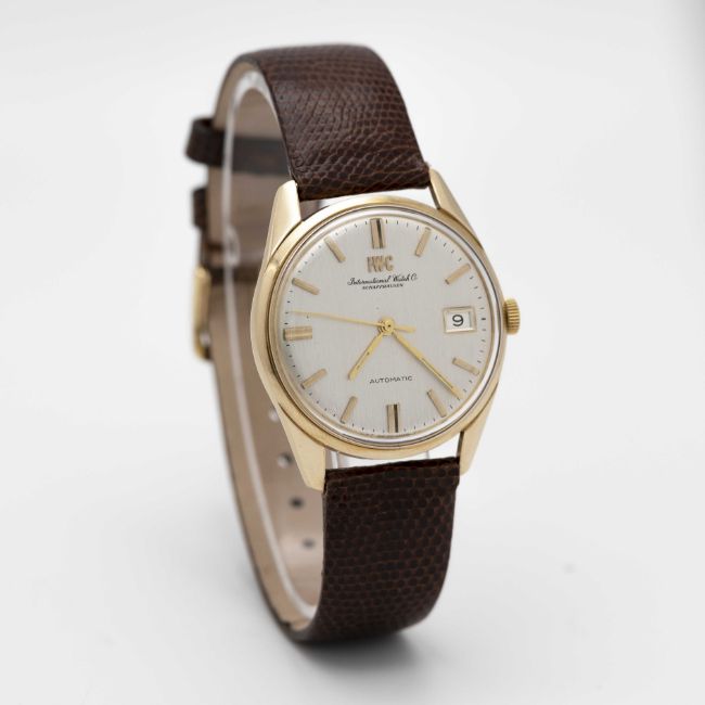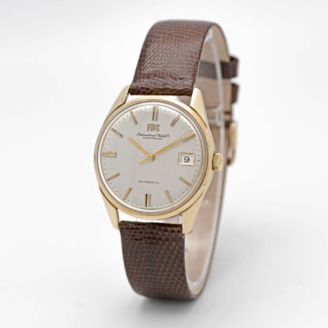 A GENTLEMAN'S 9K SOLID GOLD IWC AUTOMATIC WRIST WATCHCIRCA 1969, REF. 810A WITH BRUSHED SILVER DIALMovement: 25J, automatic, cal. 8541, signed International Watch Co, numbered 1,9xx,xxx. Case: Diameter approx. 34.5mm, snap back, signed International Watch Co, 9k hallmarks, numbered 1,8xx,xxx, IWC crown.Strap: Leather.CONDITION REPORTDial: Original dial in excellent condition. Movement: Running & functioning at present, timekeeping and accuracy cannot be guaranteed.Case: In very good condition, with some light scratches due to general use.Strap: In excellent condition.