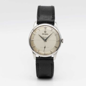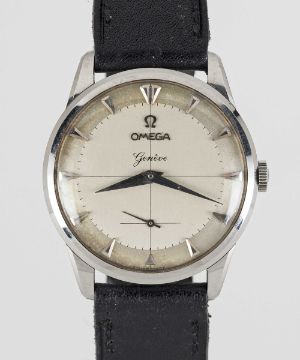 A GENTLEMAN'S LARGE STAINLESS STEEL OMEGA GENEVE WRIST WATCHCIRCA 1950s, REF. 2748-7 WITH TWO TONE SILVER "CROSSHAIRS" DIALMovement: 24J, manual, cal. 266, signed Omega Watch Co., numbered. Case: Diameter approx. 36mm, signed Omega Watch Co, Omega crown.Strap: Leather with Omega pin buckle.CONDITION REPORTDial: Original dial in good condition, showing some signs of age. Movement: Running & functioning at present, timekeeping and accuracy cannot be guaranteed.Case: In excellent condition, with light scratches due to general use.Strap: In excellent condition.