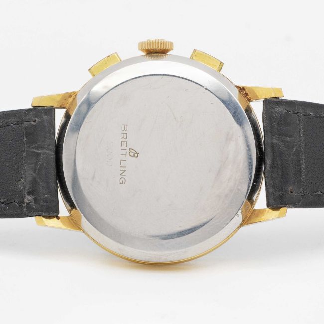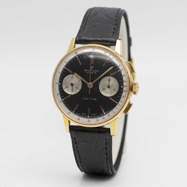 A GENTLEMAN'S GOLD PLATED BREITLING TOP TIME CHRONOGRAPH WRIST WATCHCIRCA 1965, REF. 2000Movement: 17J, manual wind, Venus cal. 188, signed Breitling Watch Ltd.Case: Diameter approx. 35mm, stainless steel snap back, signed Breitling Watch Ltd, numbered, Breitling crown.Strap: Leather.CONDITION REPORTDial: Original dial in excellent condition, showing some small signs of age. Movement: Running & functioning at present, timekeeping and accuracy cannot be guaranteed.Case: In excellent condition, with light scratches due to general use.Strap: In excellent condition.