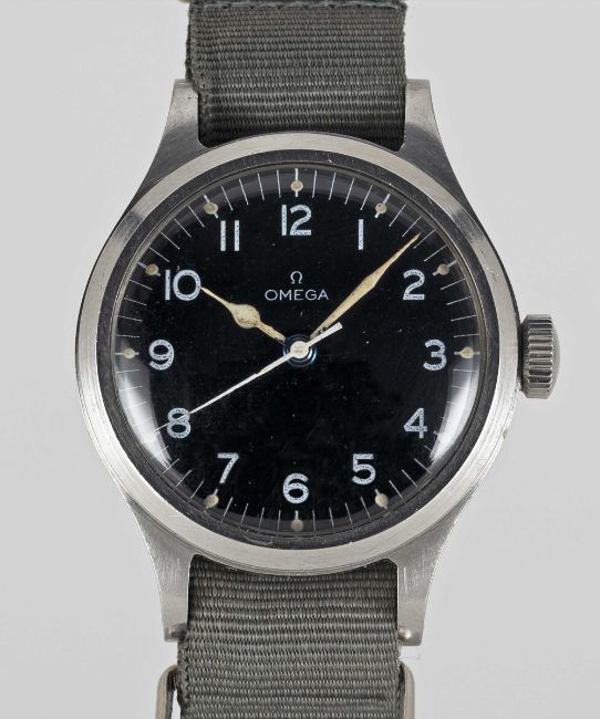 A GENTLEMAN'S STAINLESS STEEL BRITISH MILITARY OMEGA RAF PILOTS WRIST WATCHDATED 1956, WITH BLACK MOD DIALMovement: 16J, manual wind, cal. 30T2SC, signed Omega, numbered 9,8xx,xxx.Case: Diameter approx. 36mm, fixed bars, screw back, issue markings A.M. 6B/159 2172/56, inner ring.Strap: NATO.CONDITION REPORTDial: Original MOD dial in very good condition, showing some small signs of age.Movement: Running & functioning at present, timekeeping and accuracy cannot be guaranteed.Case: In excellent condition, with small scratches due to military use.Strap/Bracelet: In excellent condition.