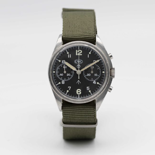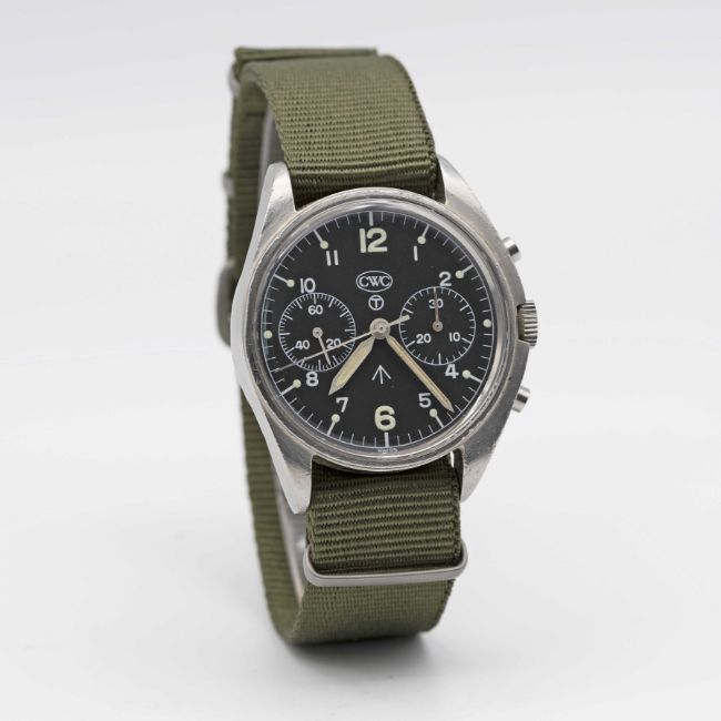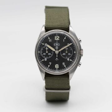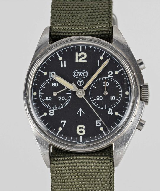 A GENTLEMAN'S STAINLESS STEEL BRITISH MILITARY CWC RAF PILOTS CHRONOGRAPH WRIST WATCHDATED 1980, PART OF THE "FAB FOUR", WITH MOD DIALMovement: 17J, manual wind, Valjoux cal. 7733.Case: Diameter approx. 39mm, fixed bars, screw back, signed CWC, issue markings 6BB-924-3306 ^ 670/80. Strap: NATO.CONDITION REPORTDial: Original MOD dial in excellent condition.Movement: Running & functioning at present, timekeeping and accuracy cannot be guaranteed.Case: In very good condition, with small scratches and light wear due to use.Strap: In excellent condition.