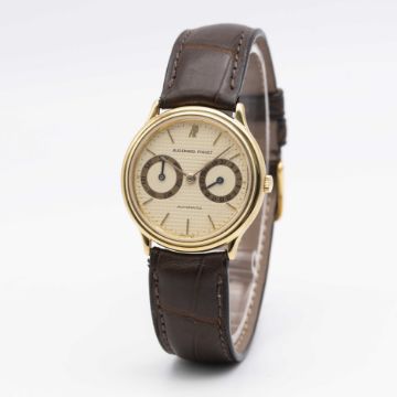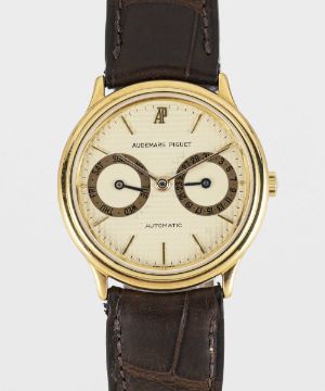 A GENTLEMAN'S 18K SOLID GOLD AUDEMARS PIGUET AUTOMATIC DAY DATE WRIST WATCHCIRCA 1990, WITH CREAM "TAPISSERIE" DIALMovement: Automatic, signed Audemars Piguet, numbered.Case: Diameter approx. 33mm, signed Audemars Piguet, 18k hallmarks, numbered.Strap: Leather.CONDITION REPORTDial: Original dial in very good condition.Movement: Running & functioning at present, timekeeping and accuracy cannot be guaranteed.Case: In excellent condition.Strap/Bracelet: In excellent condition.
