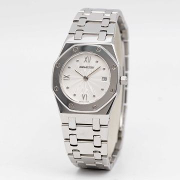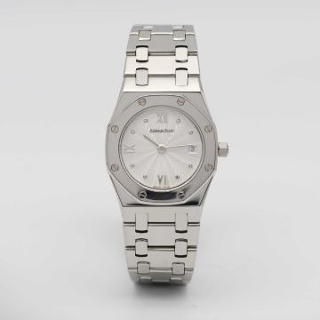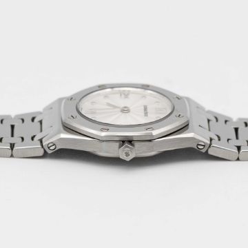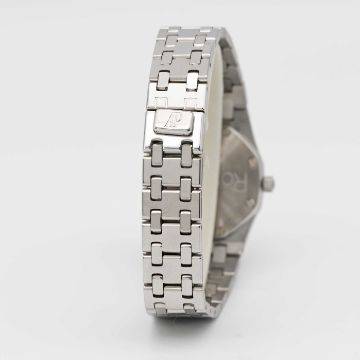 A LADIES STAINLESS STEEL AUDEMARS PIGUET ROYAL OAK BRACELET WATCHCIRCA 2000, REF. 67470ST.PP.1120ST.02.A. WITH SILVER GUILLOCHE DIAL, SERVICED BY AUDEMARS PIGUET IN 2021Movement: Quartz, signed Audemars Piguet.Case: Width approx. 24.5mm, signed Audemars Piguet Royal Oak, numbered 91x, E series, AP crown.Bracelet: Original stainless steel AP Royal Oak bracelet with flip-lock clasp.CONDITION REPORTDial: Original dial in excellent condition.Movement: Running & functioning at present, timekeeping and accuracy cannot be guaranteed.Case: In excellent condition.Bracelet: In excellent condition.