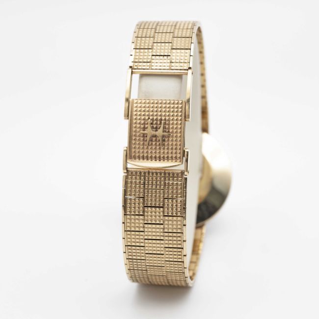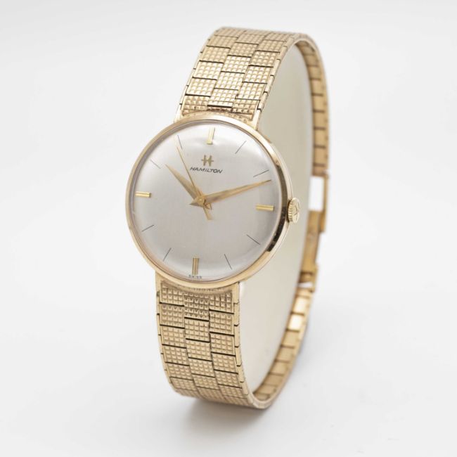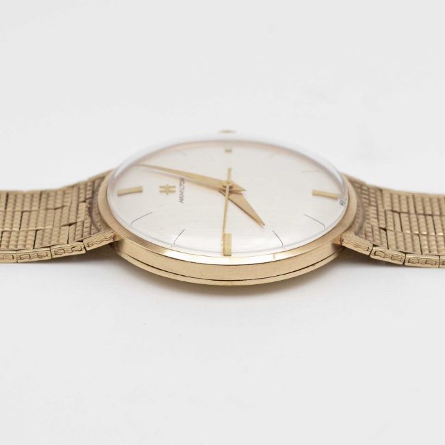 A GENTLEMAN'S 9K SOLID GOLD HAMILTON BRACELET WATCHDATED 1974 WITH ORIGINAL BOX AND GUARANTEE BOOKLETMovement: 17J, manual wind, cal. 60, signed Hamiliton.Case: Width approx. 31mm, snap back, signed DS&S, 9K hallmarks, numbered.Bracelet: Original Hamilton 9k solid gold bracelet. Measures approx 185mm.CONDITION REPORTDial: Original dial in excellent condition.Movement: Running & functioning at present, timekeeping and accuracy cannot be guaranteed.Case: In excellent condition, with some light scratches due to general use.Bracelet: In excellent condition, showing some small signs of age.