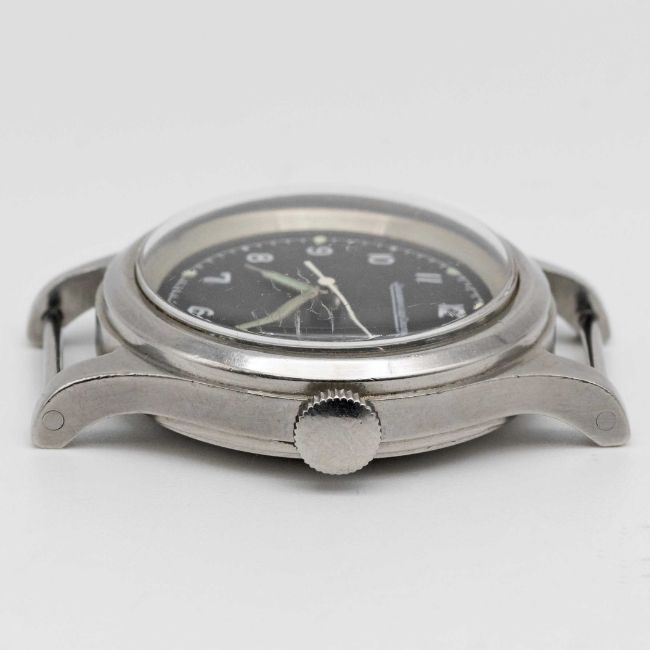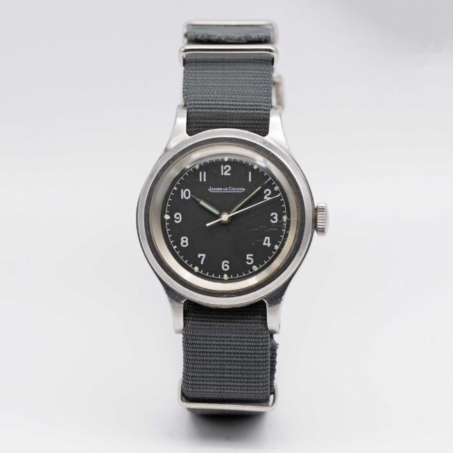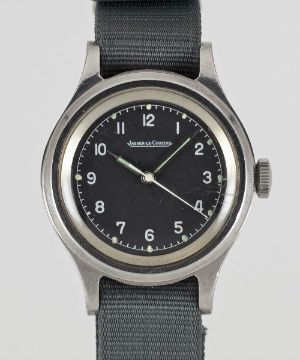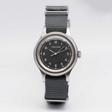 A GENTLEMAN'S STAINLESS STEEL BRITISH MILITARY JAEGER LECOULTRE RAF PILOTS WRIST WATCHDATED 1956, WITH BLACK MOD DIALMovement: Manual wind, cal. 470, signed Jaeger-LeCoultre, numbered 26x,xxx.Case: Diameter approx. 35.5mm, fixed bars, screw back, issue markings A.M. 6B/159 4434/56, dust cover.Strap: NATO.CONDITION REPORTDial: Original MOD dial in excellent condition, showing some small signs of age. Movement: Running & functioning at present, timekeeping and accuracy cannot be guaranteed.Case: In excellent condition, with some small scratches due to use.Strap: In excellent condition.