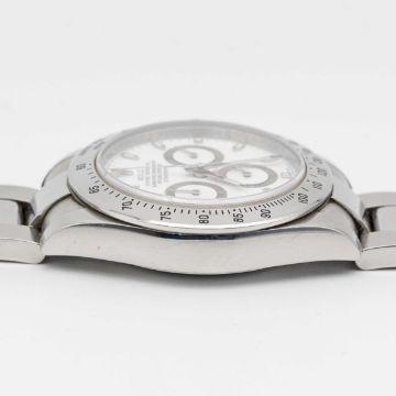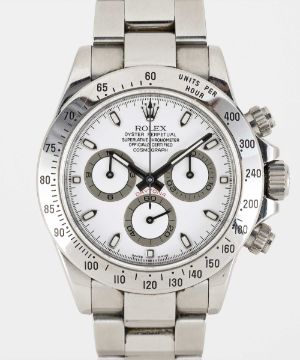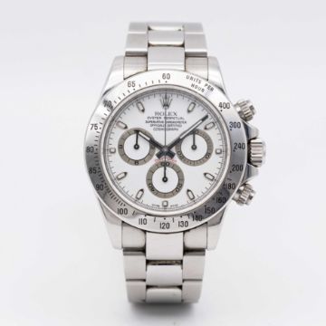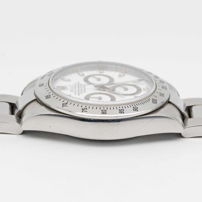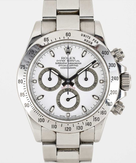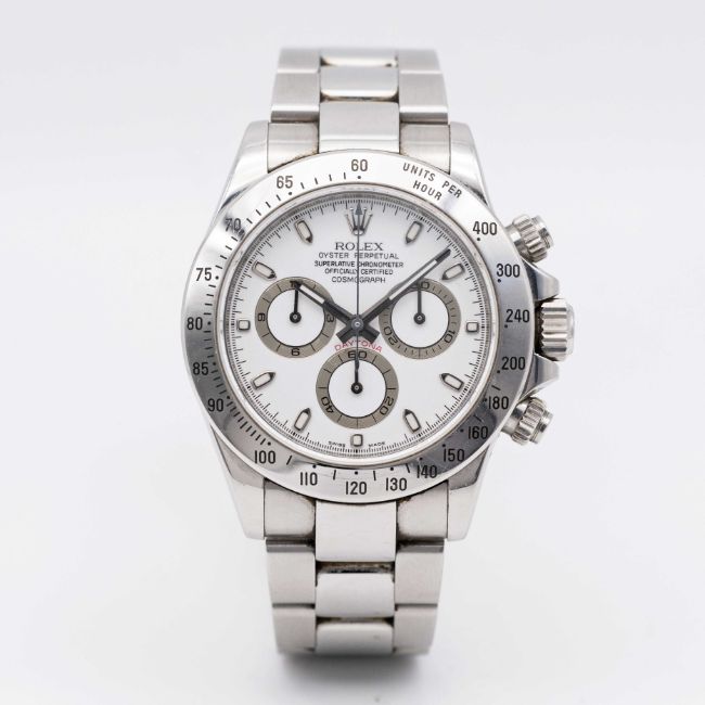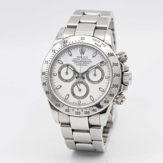 A GENTLEMAN'S STAINLESS STEEL ROLEX OYSTER PERPETUAL COSMOGRAPH DAYTONA BRACELET WATCHCIRCA 2008, REF. 116520 WITH WHITE DIAL, ACCOMPANIED BY ORIGINAL BOX, GUARANTEE CARD, BOOKLET & TAGSMovement: Automatic chronometer, cal. 4130, signed Rolex, numbered.Case: Diameter approx. 39mm, Oyster case, signed Rolex, signed Montres Rolex S.A., numbered rehaut, units per hour bezel, sapphire crystal, Rolex Triplock screw-down crown & pushers.Bracelet: Original Rolex Oyster Daytona bracelet, numbered 78490/PJ5.CONDITION REPORTDial: Original dial in excellent condition.Movement: Running & functioning at present, timekeeping and accuracy cannot be guaranteed.Case: In very good condition, with some scratches due to general use.Strap/Bracelet: In very good condition, with light scratches.