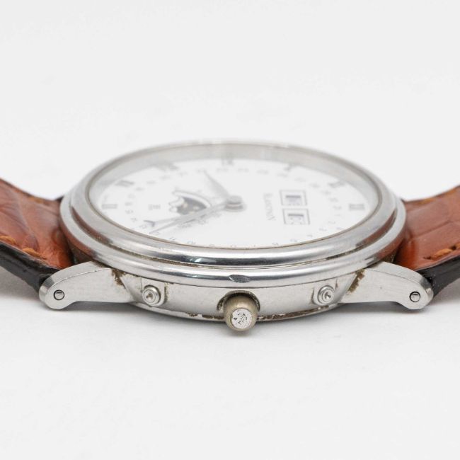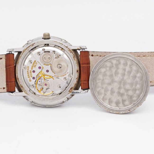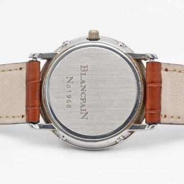 A GENTLEMAN'S STAINLESS STEEL BLANCPAIN VILLERET MOONPHASE TRIPLE CALENDAR WRIST WATCHCIRCA 1980s  Movement: 17J, manual wind, cal. 65, signed Blancpain.Case: Diameter approx. 33.5mm, signed Blancpain, numbered.Strap: Leather.CONDITION REPORTDial: Original dial in excellent condition.Movement: Running & functioning at present, timekeeping and accuracy cannot be guaranteed.Case: In very good condition, with some scratches due to general use, crown very worn.Strap/Bracelet: In very good condition.
