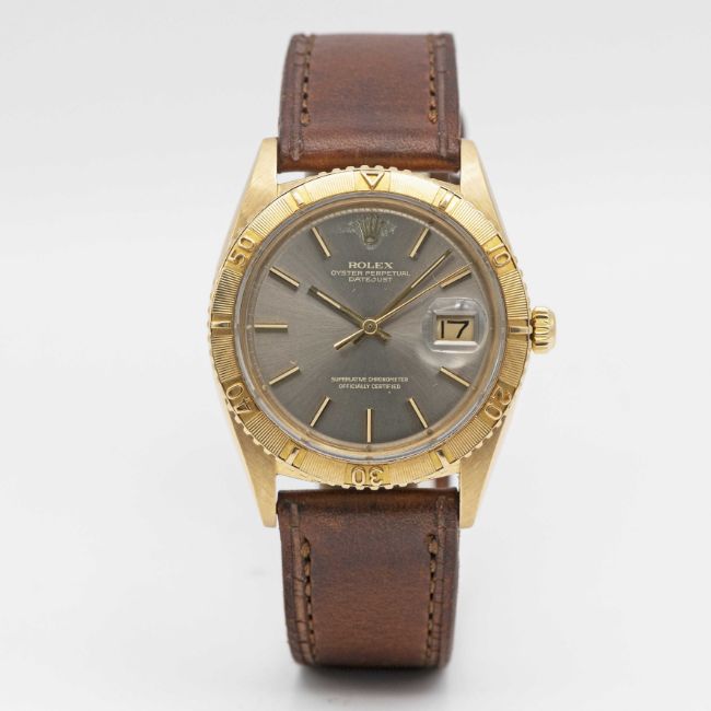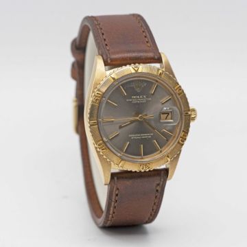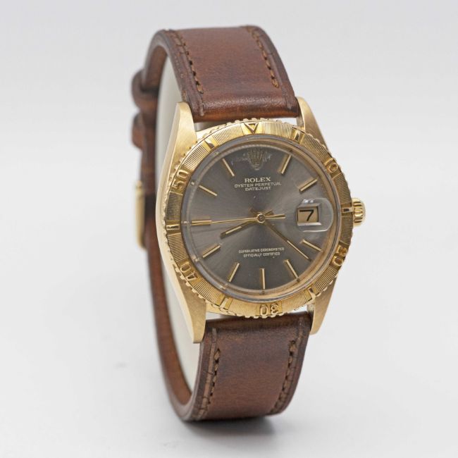 A GENTLEMAN'S 18K SOLID YELLOW GOLD ROLEX OYSTER PERPETUAL DATEJUST TURNOGRAPH WRIST WATCHCIRCA 1972, REF. 1625/8 WITH GREY SUNBURST "GHOST" DIALMovement: 26J, automatic chronometer, cal. 1570, signed Montres Rolex S.A., numbered.Case: Diameter approx. 36mm, Oyster case, signed Montres Rolex S.A., 18k hallmarks, serial no. 3,1xx,xxx, solid gold rotating "Thunderbird" bezel, Rolex crown.Strap: Leather.CONDITION REPORTDial: Original dial in good condition, showing some signs of age around the coronet.Movement: Running & functioning at present, timekeeping and accuracy cannot be guaranteed.Case: In very good condition, with light dent to case back, light wear to crown.Strap/Bracelet: In very good condition.