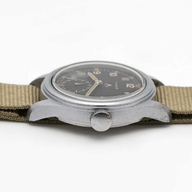 A GENTLEMAN'S STAINLESS STEEL BRITISH MILITARY TIMOR W.W.W. WRIST WATCHCIRCA 1945, PART OF THE "DIRTY DOZEN"Movement: 15J, manual wind, cal. 6060, numbered, signed Timor.Case: Diameter approx. 36mm, fixed bars, nickel plated case with stainless steel screw back, issue markings TIMOR ^ W.W.W. K 5555 35455, dust cover.Strap: NATO.CONDITION REPORTDial: Original dial in excellent condition, showing some very small signs of age. Movement: Running & functioning at present, timekeeping and accuracy cannot be guaranteed.Case: In very good condition, with some light scratches and wear due to use.Strap: In excellent condition.