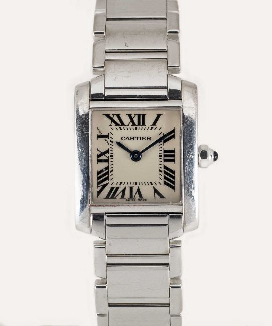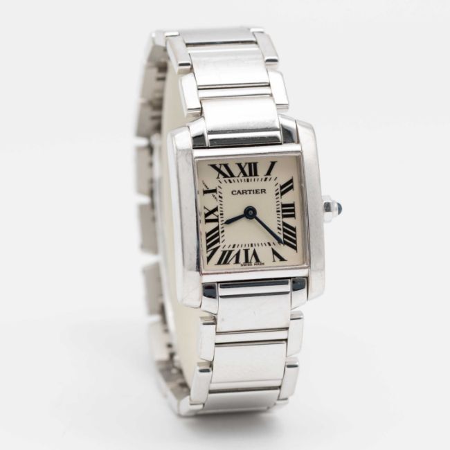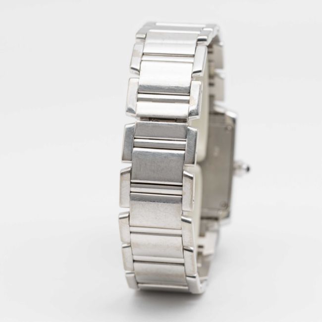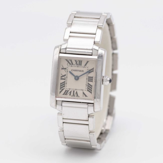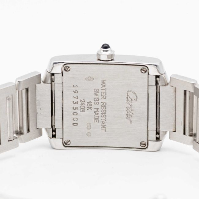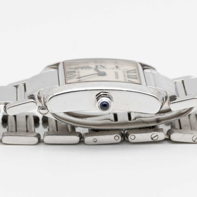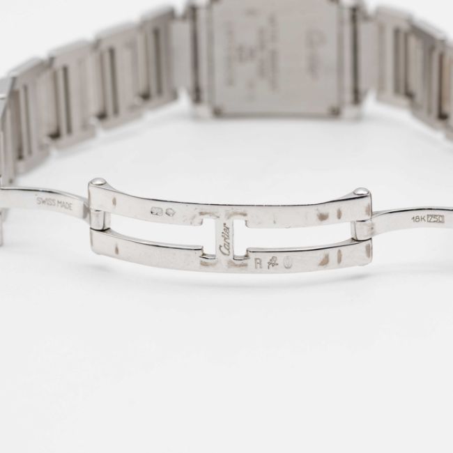 A LADIES 18K SOLID WHITE GOLD CARTIER TANK FRANCAISE BRACELET WATCHCIRCA 2005, REF. 2403  Movement: Quartz, signed Cartier.Case: Width approx. 20mm, signed Cartier, numbered, 18k hallmarks, sapphire crown.Bracelet: Original 18k solid white gold Cartier bracelet.CONDITION REPORTDial: Original dial in excellent condition.Movement: Running & functioning at present, timekeeping and accuracy cannot be guaranteed.Case: In very good condition, scratches due to general useBracelet: In very good condition with some scratches due to general use.