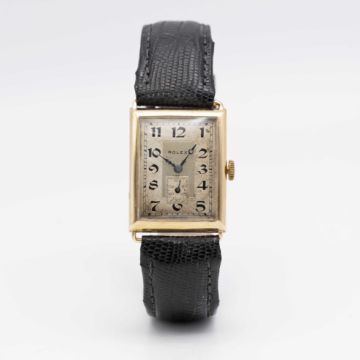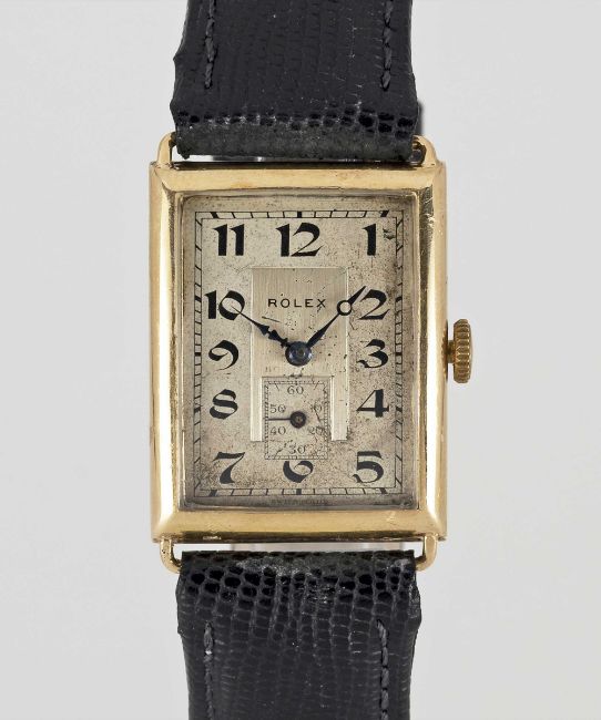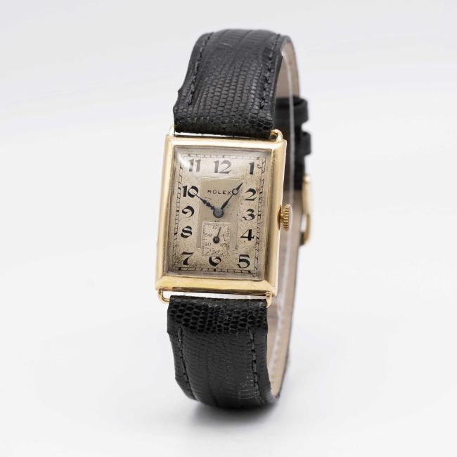A GENTLEMAN'S 18K SOLID GOLD RECTANGULAR ROLEX WRIST WATCHCIRCA 1930s, REF. 869Movement: 15J, manual wind, signed Rolex Extra Prima Timed 6 Positions For All Climates.Case: Approx. 30mm by 24mm, hinged back, signed Rolex 7 World's Records, numbered, 18k hallmarks. Presentational inscription to case back, presented to J.R. Sparks from the Jamalpur E.I.R (East Indian Railway) dated 1935.Strap: Leather.CONDITION REPORTDial: Original dial in fair condition, showing signs of age.Movement: Running & functioning at present, timekeeping and accuracy cannot be guaranteed.Case: In very good condition, with some scratches and wear due to general use.Strap/Bracelet: In very good condition.