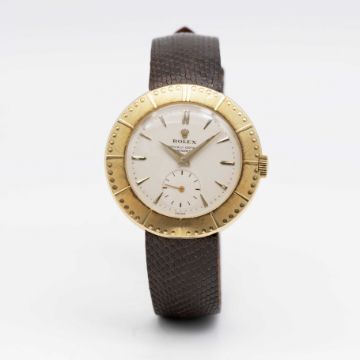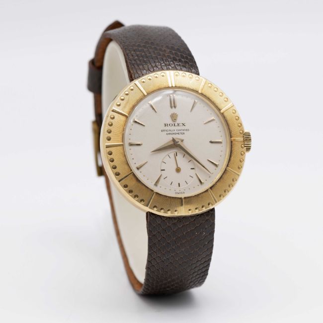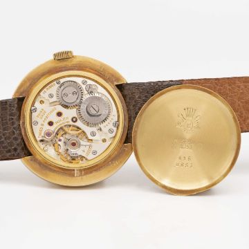 A RARE GENTLEMAN'S 18K SOLID GOLD ROLEX OFFICIALLY CERTIFIED CHRONOMETER WRIST WATCHCIRCA 1953, REF. 8651 ACCOMPANIED BY ROLEX BOXMovement: 18J, manual wind, cal. 700, signed Rolex Chronometer , numbered.Case: Diameter approx. 35mm, snap back, signed Rolex, numbered.Strap: Leather.CONDITION REPORTDial: Original dial in excellent condition.Movement: Running & functioning at present, timekeeping and accuracy cannot be guaranteed.Case: In very good condition with some scratches due to general use.Strap: In excellent condition.