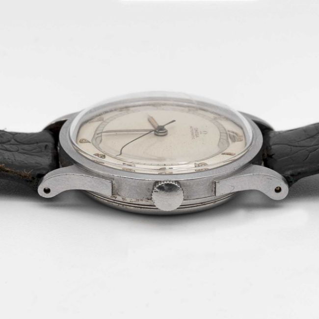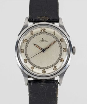 A GENTLEMAN'S STAINLESS STEEL OMEGA AUTOMATIC WRIST WATCH CIRCA 1940s, REF. 2420-1 H WITH LUMINOUS ART DECO NUMERALS & "SYRINGE" HANDSMovement: 17J, "bumper" automatic movement, signed Omega, numbered 10,xxx,xxx.Case: Width approx. 33mm, snap back, signed Omega Watch Co. Strap: Leather strap, original stainless steel Omega pin buckle. CONDITION REPORTDial: Original dial in very good condition, showing some signs of age. Movement: Running & functioning at present, timekeeping and accuracy cannot be guaranteed.Case: In very good condition, with some light scratches due to general use.Strap: In very good condition.