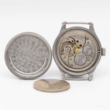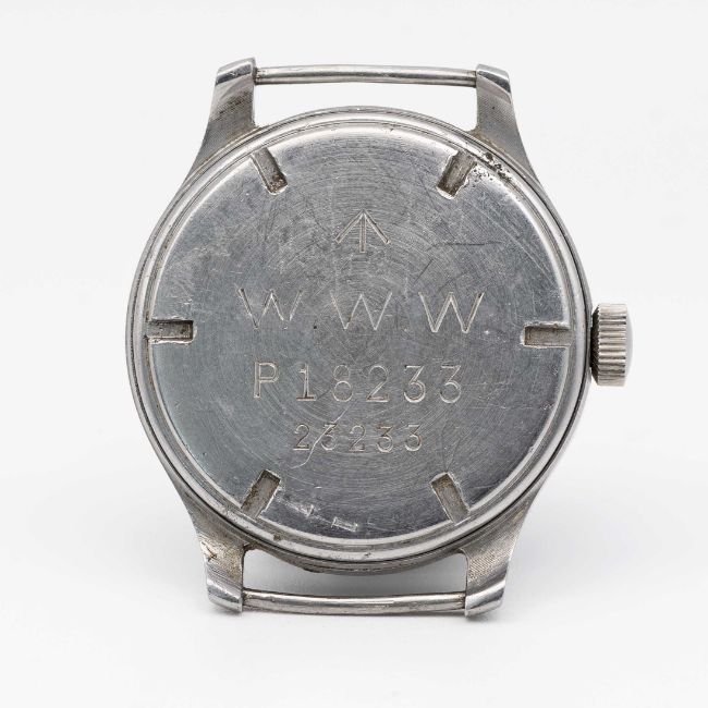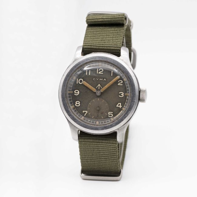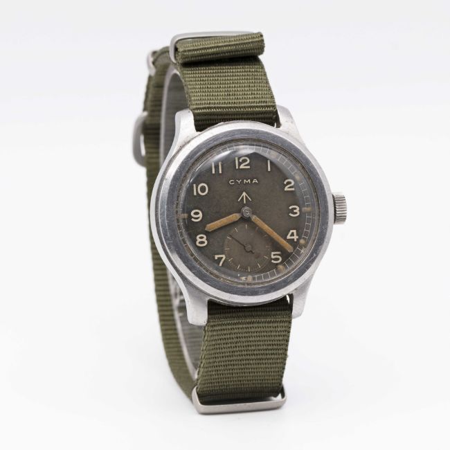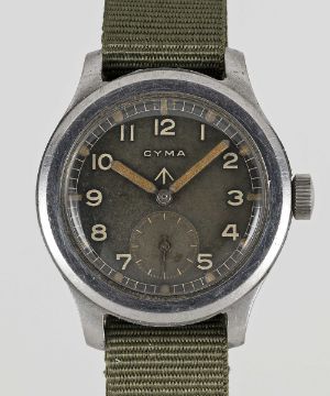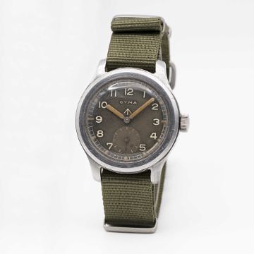 A GENTLEMAN'S STAINLESS STEEL BRITISH MILITARY CYMA W.W.W. WRIST WATCHCIRCA 1945, PART OF THE "DIRTY DOZEN", DIAL TURNING "TROPICAL" BROWNMovement: 15J, manual wind, cal. 234, signed Cyma, numbered.Case: Diameter approx. 38mm, fixed bars, screw back, issue markings ^ W.W.W. P18233 23233, dust cover.Strap: NATO.CONDITION REPORTDial: Original dial in very good "tropical" condition.Movement: Running & functioning at present, timekeeping and accuracy cannot be guaranteed.Case: In very good condition, with some scratches and light wear due to use.Strap: In excellent condition.