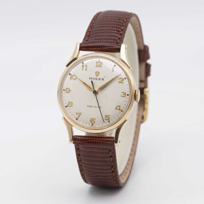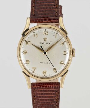 A GENTLEMAN'S 9CT SOLID GOLD ROLEX PRECISION WRIST WATCHCIRCA 1950sMovement: 17J, manual wind, cal. 1215, signed Montres Rolex S.A., numbered.Case: Diameter approx. 31mm, signed Dennison Made in England for Rolex, 9ct hallmarks, numbered, Rolex crown.Strap: Leather.CONDITION REPORTDial: Original dial in good condition, showing some signs of age.Movement: Running & functioning at present, timekeeping and accuracy cannot be guaranteed.Case: In very good condition, with some light scratches and wear due to general use.Strap: In excellent condition.