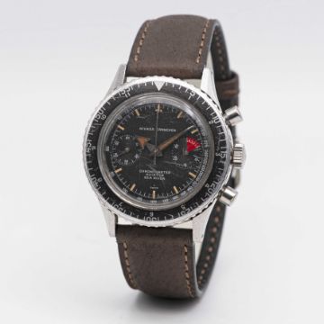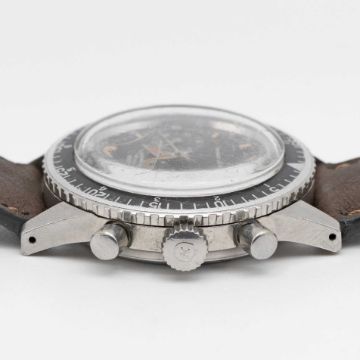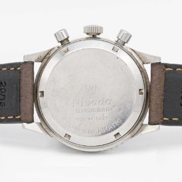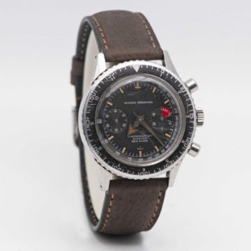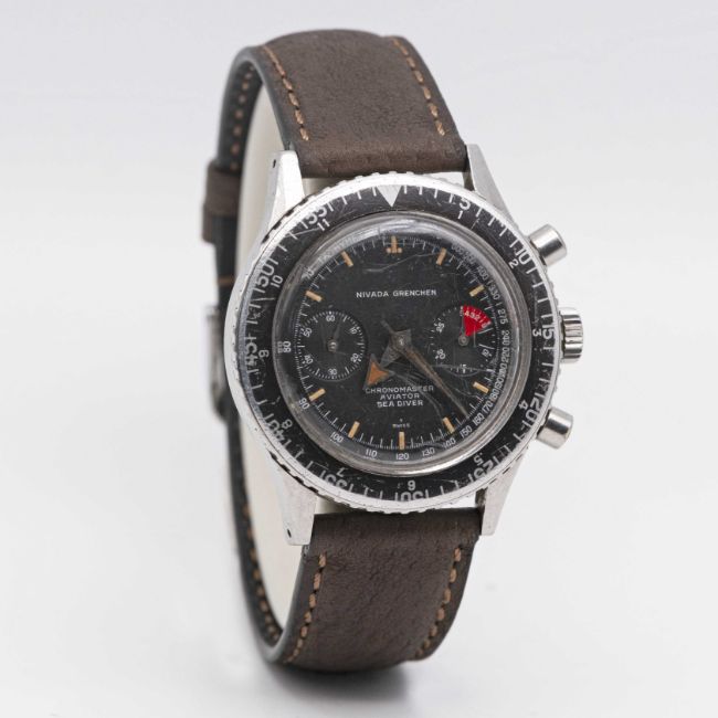 A GENTLEMAN'S STAINLESS STEEL NIVADA GRENCHEN CHRONOMASTER AVIATOR SEA DIVER CHRONOGRAPH WRIST WATCHDATED 1966, REF. 1581 WITH VALJOUX 92 MOVEMENT, ACCOMPANIED BY ORIGINAL BOX AND GUARANTEE BOOKLET Movement: 17J, manual wind, Valjoux cal. 92, signed Nivada.Case: Diameter approx. 38mm, screw back, signed Nivada Grenchen, numbered, rotating MH bezel, Nivada crown.Strap: Leather.CONDITION REPORTDial: Original dial in excellent condition, showing some small signs of age. Movement: Running & functioning at present, timekeeping and accuracy cannot be guaranteed.Case: In good condition, with small scratches and wear to the bezel due to general use.Strap: In excellent condition.