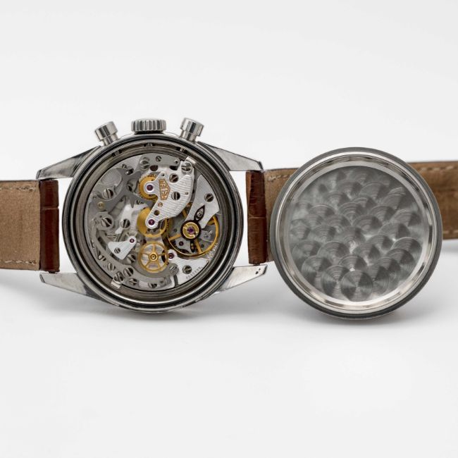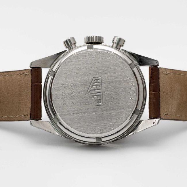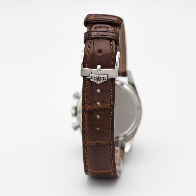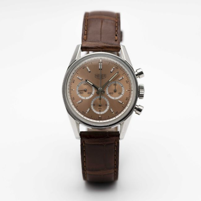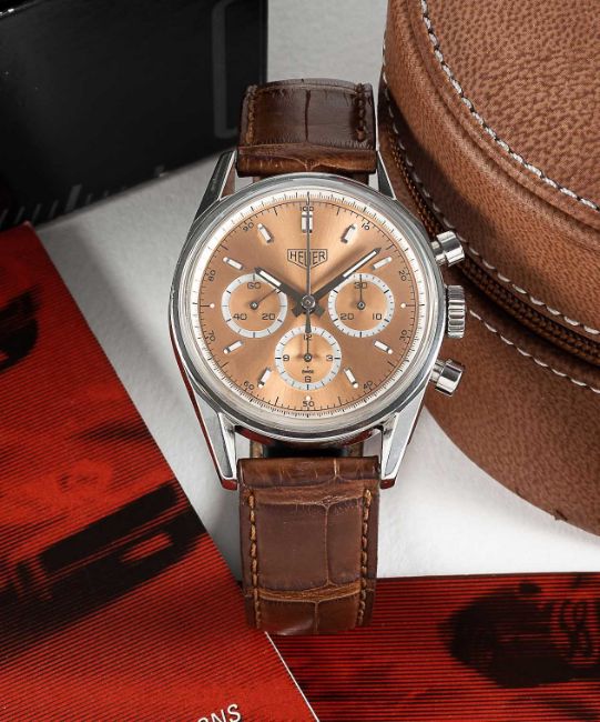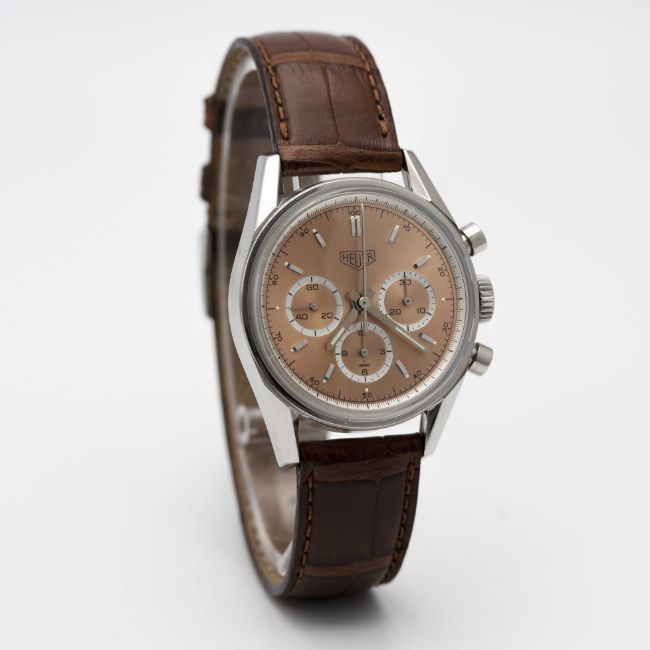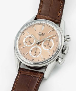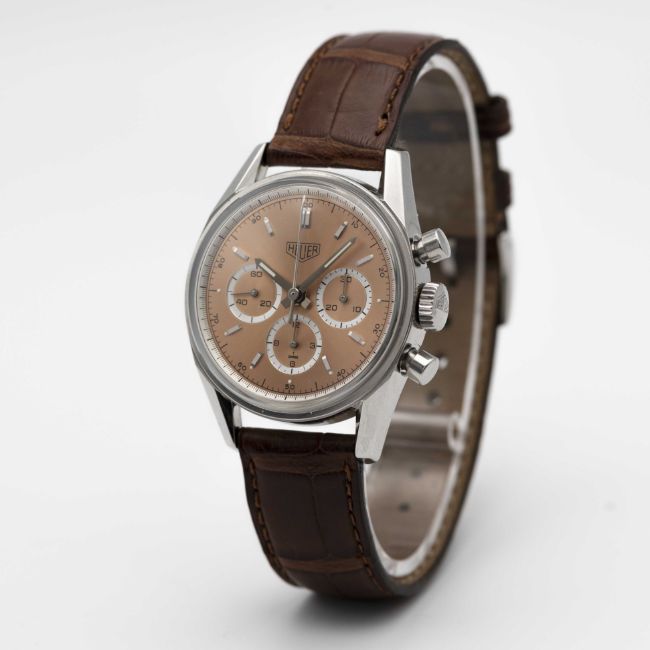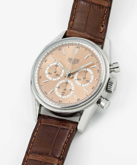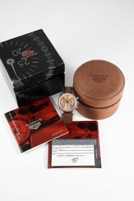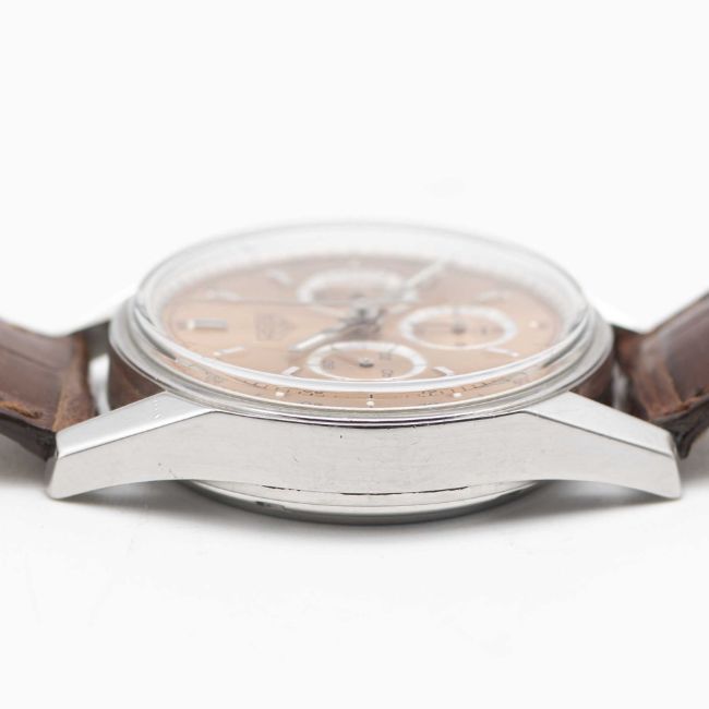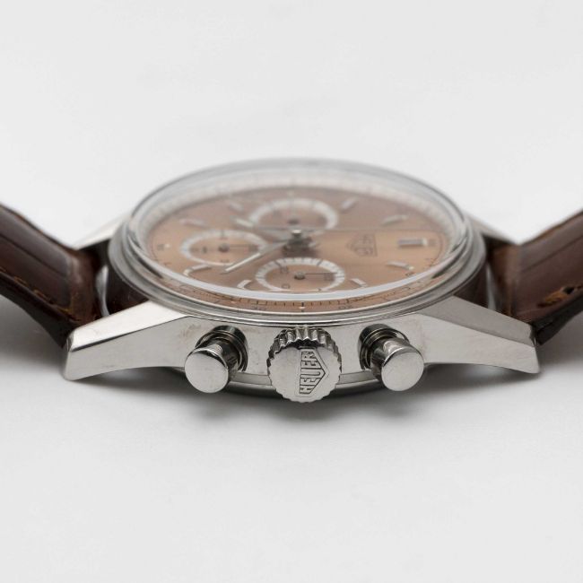 A RARE GENTLEMAN'S STAINLESS STEEL HEUER CARRERA CHRONOGRAPH WRIST WATCHDATED 2001, REF. CS3112 FIRST CARRERA RE-EDITION WATCH WITH RARE SALMON DIAL ACCOMPANIED BY ORIGINAL BOX, BOOKLETS AND WARRANTY CARDMovement: 18J, manual, Lemania cal. 1873, signed Heuer, numbered.Case: Diameter approx. 35.5mm, screw back, engraved "1964 Heuer Carrera Re-edition", signed Heuer, numbered, Heuer crown & pushers.Strap: Leather strap with original Heuer pin buckle. CONDITION REPORTDial: Original dial in excellent condition.Movement: Running & functioning at present, timekeeping and accuracy cannot be guaranteed.Case: In excellent condition, with light scratches due to general use.Strap: In very good condition, showing signs of wear.