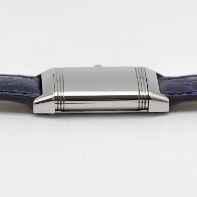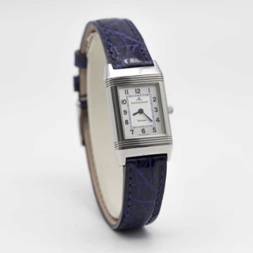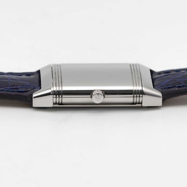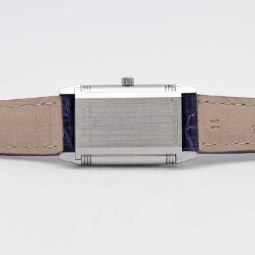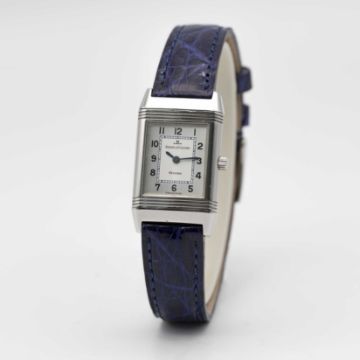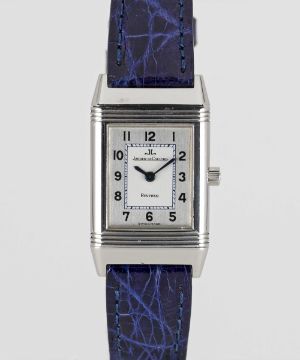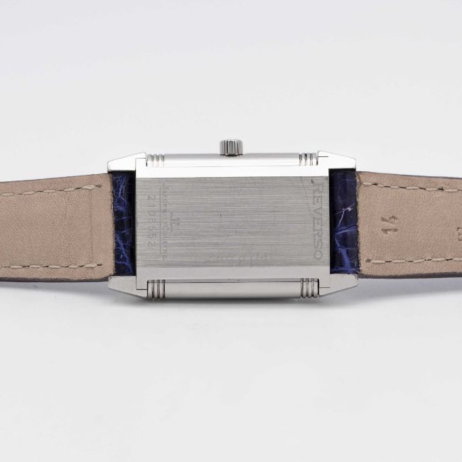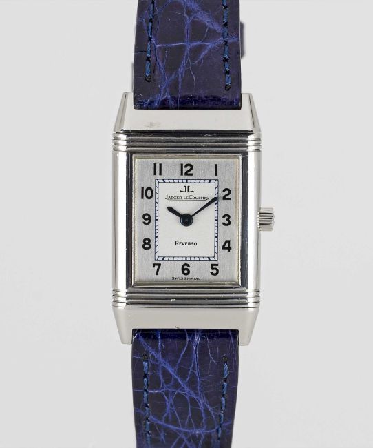 A LADIES STAINLESS STEEL JAEGER LECOULTRE REVERSO WRIST WATCHCIRCA 1990s, REF. 260.8.08 WITH JAEGER-LECOULTRE BOXMovement: Manual wind, signed Jaeger-LeCoultre.Case: Approx. 33mm by 19.5mm, plain reverse side, signed Jaeger-LeCoultre Reverso, numbered, JLC crown.Strap: Leather.CONDITION REPORTDial: Original dial in excellent condition.Movement: Running & functioning at present, timekeeping and accuracy cannot be guaranteed.Case: In excellent condition.Strap: In excellent condition.