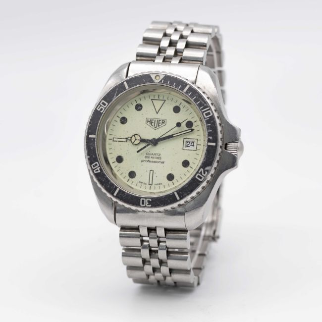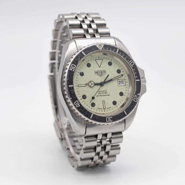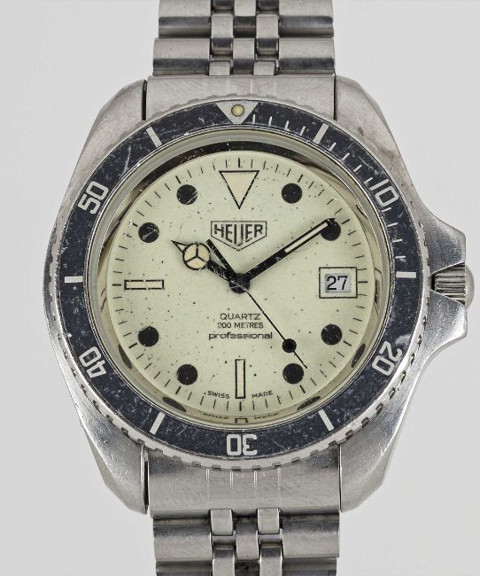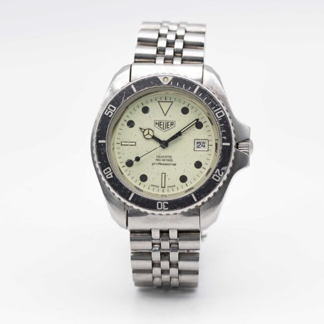 A GENTLEMAN'S STAINLESS STEEL HEUER PROFESSIONAL 200 METERS "NIGHT DIVER" QUARTZ DIVERS BRACELET WATCHCIRCA 1980s, REF. 980.032 WITH FULLY LUMINOUS DIAL Movement: ESA Quartz. Numbered.Case: Diameter approx. 42mm, screw back, signed Heuer- Leonidas S.A., numbered, 60 minute rotating bezel, screw-down crown.Strap: Original stainless steel Heuer bracelet, with flip lock clasp and divers extension. CONDITION REPORTDial: Original dial in excellent condition.Movement: Running & functioning at present, timekeeping and accuracy cannot be guaranteed.Case: In good condition, with scratches and wear due to general use. Some scratches to the glass. Bracelet: In good condition, with some scratches and wear.