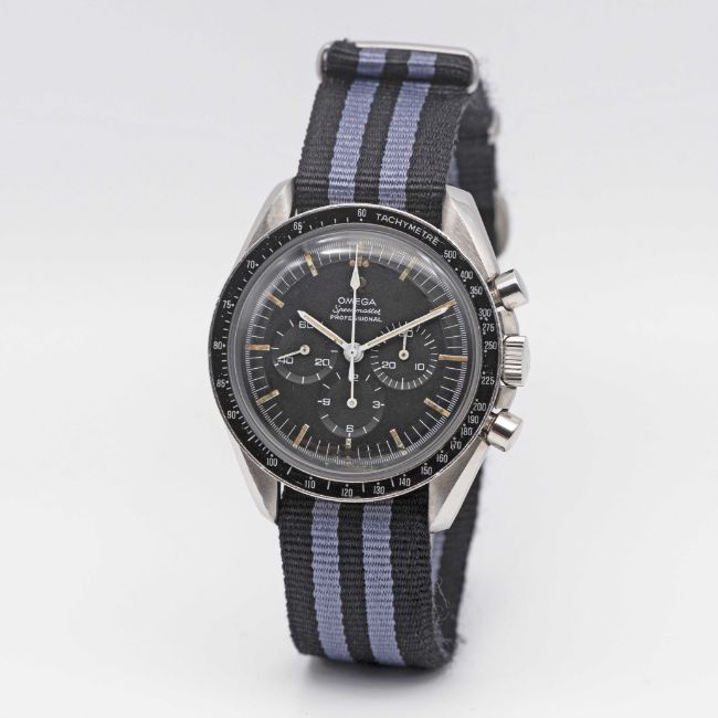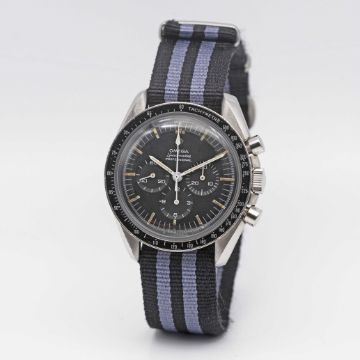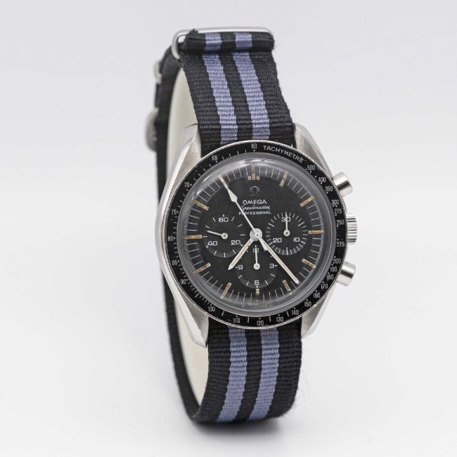 A GENTLEMAN'S STAINLESS STEEL OMEGA SPEEDMASTER PROFESSIONAL "PRE MOON" CHRONOGRAPH WRIST WATCHCIRCA 1967, REF. 145.012-67 SP WITH CAL. 321 MOVEMENTMovement: 17J, manual wind, cal. 321, signed Omega Watch Co, numbered 24,xxx,xxx.Case: Diameter approx. 42mm, screw back, Speedmaster emblem on case back, signed Omega Watch Co, antimagnetic dust cover, tachymetre bezel, Omega crown.Strap: NATO.CONDITION REPORTDial: Original dial in good condition, with signs of age and some wear.Movement: Running & functioning at present, timekeeping and accuracy cannot be guaranteed.Case: In excellent condition, with light scratches due to general use.Strap: In excellent condition.