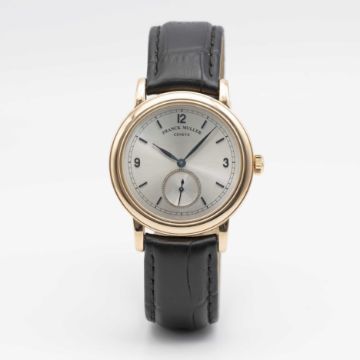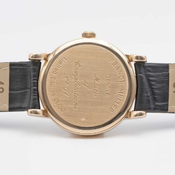 A RARE GENTLEMAN'S 18K SOLID ROSE GOLD FRANCK MULLER WRIST WATCHCIRCA 1990s, LIMITED EDITION NO 1 OF 50 PIECESMovement: Manual wind, ETA base ref.7500, signed Franck Muller.Case: Diameter approx. 36mm, signed Franck Muller Geneve Master of Complications No1/50, 18k hallmarks, original crown.Strap: Leather.CONDITION REPORTDial: Original dial in excellent condition.Movement: Running & functioning at present, timekeeping and accuracy cannot be guaranteed.Case: In excellent condition.Strap/Bracelet: In excellent condition.