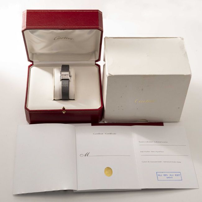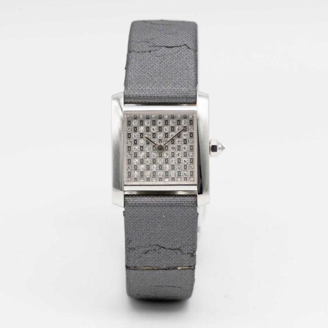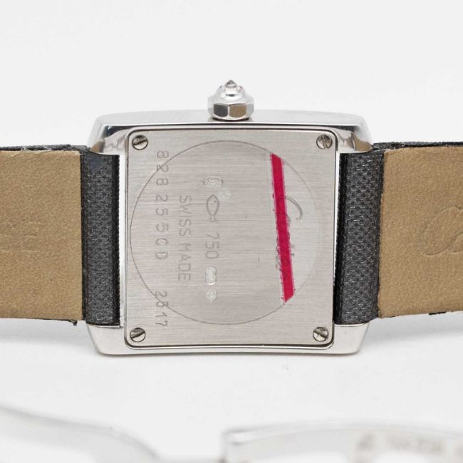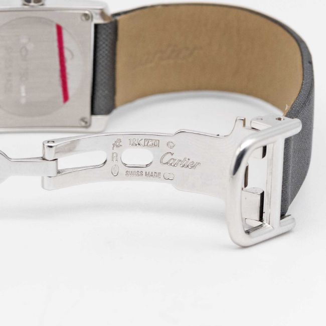 A LADIES 18K SOLID WHITE GOLD & DIAMOND CARTIER TANK FRANCAISE WRIST WATCHCIRCA 2015, REF. 2517 WITH ORIGINAL DIAMOND SET DIAL, ACCOMPANIED BY ORIGINAL CARTIER BOX & OPEN PAPERWORK WITH RETAILER'S STAMPMovement: Quartz, signed Cartier.Case: Width approx. 20mm, signed Cartier, numbered, 18k hallmarks, original diamond set crown.Strap: Leather Cartier strap with original 18k white gold deployment clasp.CONDITION REPORTDial: Original dial in excellent condition.Movement: Running & functioning at present, timekeeping and accuracy cannot be guaranteed.Case: In excellent condition. In poor condition.Strap: In poor condition.