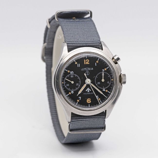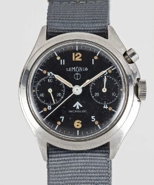 A GENTLEMAN'S STAINLESS STEEL BRITISH MILITARY ROYAL NAVY LEMANIA SINGLE BUTTON CHRONOGRAPH WRIST WATCHCIRCA 1960sMovement: 17J, manual wind, cal. 2220, signed Lemania Watch Co, numbered.Case: Diameter approx. 40mm, asymmetric with screw back, numbered 35-64, issue markings ^ 0552/924-3306 80710.Strap: NATO.CONDITION REPORTDial: Original dial in excellent condition.Movement: Running & functioning at present, timekeeping and accuracy cannot be guaranteed.Case: In excellent condition, with some scratches due to use.Strap: In excellent condition.
