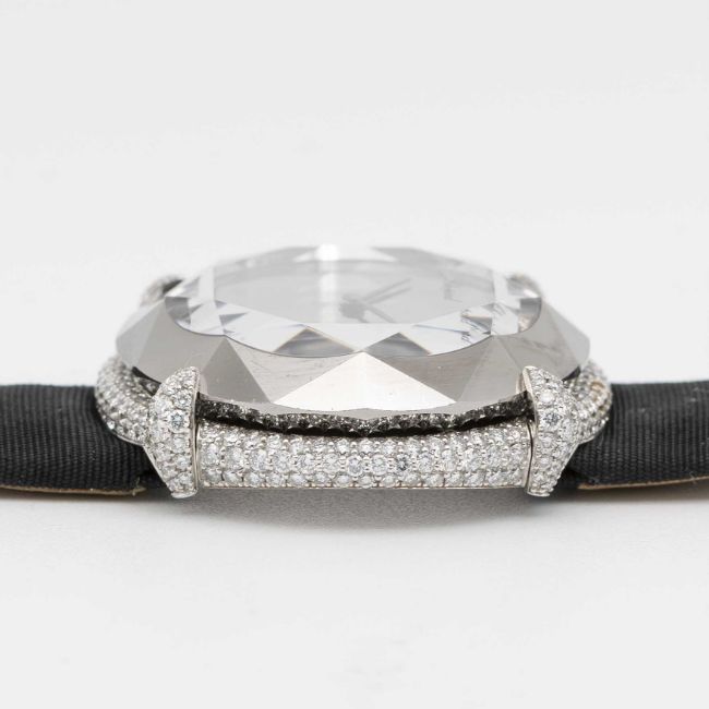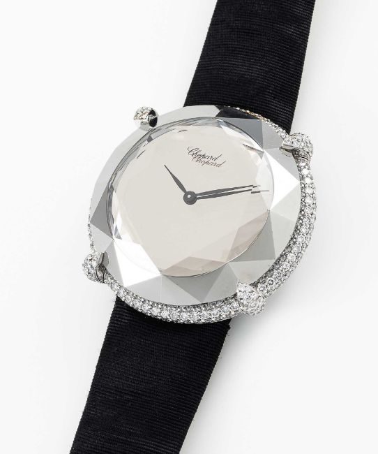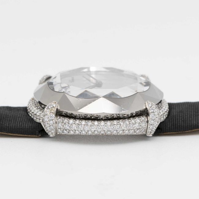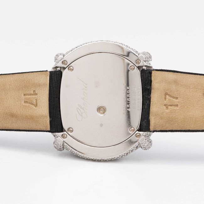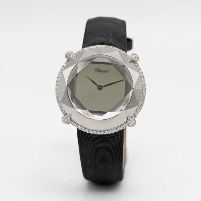 A FINE LADIES 18K SOLID WHITE GOLD, DIAMOND & CHROME CHOPARD 'GOLDEN DIAMONDS' WRIST WATCHCIRCA 1990s, REF. 45/6895 ACCOMPANIED BY ITS ORIGINAL PIN TOOL FOR SETTING THE TIMEMovement: Quartz, signed Chopard.Case: Diameter approx. 33mm, original diamond set, faceted chrome & crystal, numbered, 18k hallmarks.Strap: Original strap with 18k solid white gold pin buckle.CONDITION REPORTDial: Original dial in excellent condition.Movement: Running & functioning at present, timekeeping and accuracy cannot be guaranteed.Case: In very good condition, with scratches due to general use.Strap: In very good condition. Pin buckle in excellent condition.