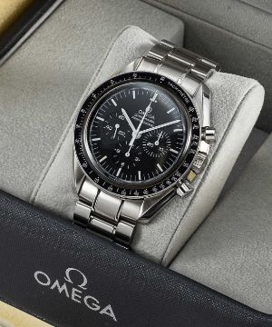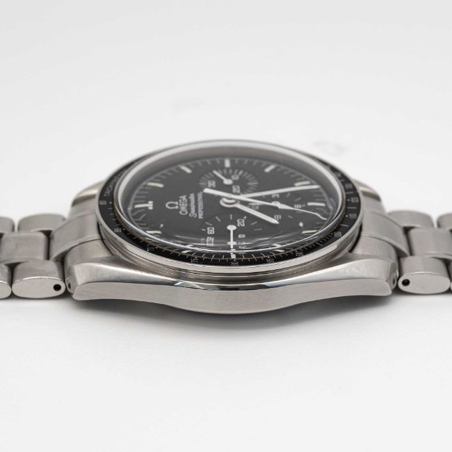 A GENTLEMAN'S STAINLESS STEEL OMEGA SPEEDMASTER PROFESSIONAL CHRONOGRAPH BRACELET WATCH DATED 2006, REF. 3574.51 APOLLO XVII LIMITED EDITION OF 3000 PIECES, WITH ORIGINAL BOX, BOOKLETS, CERTIFICATE, AND WARRANTY CARDMovement: 18J, manual wind, cal. 1861, signed Omega, numbered.Case: Diameter approx. 42mm, screw back, limited edition Apollo XVII engraving on case back, signed Omega, numbered 77,xxx,xxx, tachymetre bezel, Omega crown & pushers.Strap: Original Omega Speedmaster bracelet, no (62) 1998/849.CONDITION REPORTDial: Original dial in excellent condition.Movement: Running & functioning at present, timekeeping and accuracy cannot be guaranteed.Case: In excellent condition, with some light scratches due to general use.Bracelet: In excellent condition, with some scratches due to general use.