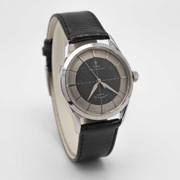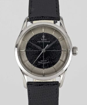 A GENTLEMAN'S STAINLESS STEEL ROLEX TUDOR OYSTER PRINCE "TUXEDO" WRIST WATCHCIRCA 1957, REF. 7967Movement: 25J, automatic, signed Tudor Auto-Prince.Case: Diameter approx. 33mm, Oyster case, signed Montres Tudor S.A., dated II.59, Rolex screw down crown.Strap: Leather.CONDITION REPORTDial: Original dial in good condition, showing some signs of age.Movement: Running & functioning at present, timekeeping and accuracy cannot be guaranteed.Case: In very good condition, with some light scratches and wear due to general use.Strap: In excellent condition.