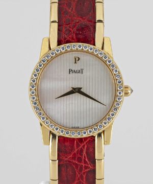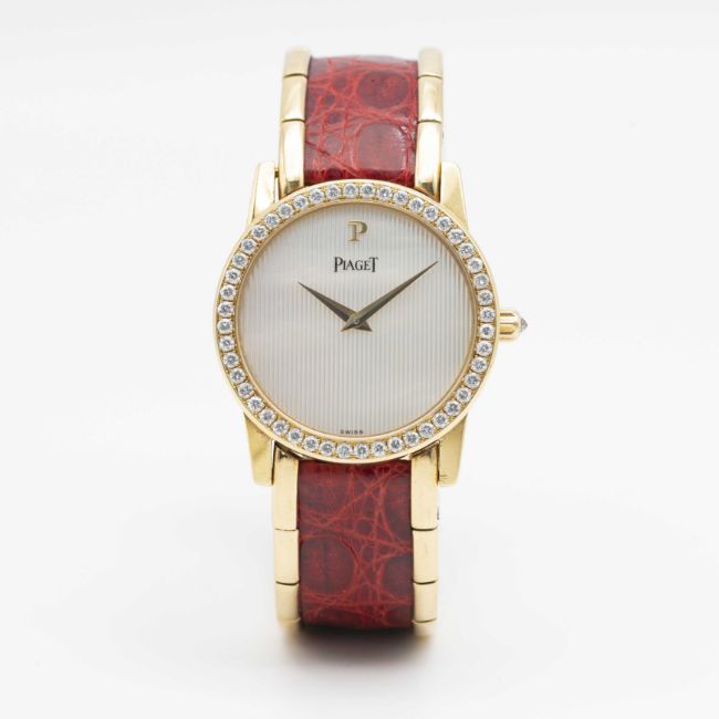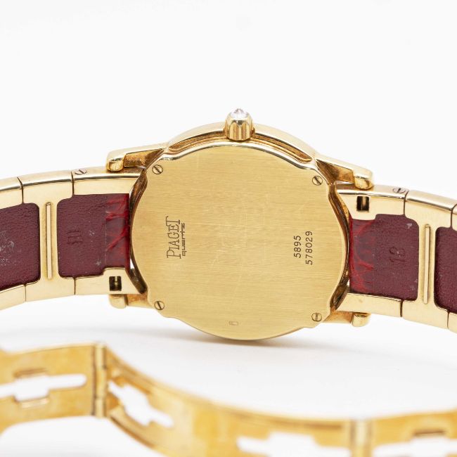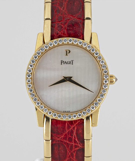 A FINE 18K SOLID GOLD & DIAMOND PIAGET BRACELET WATCHCIRCA 1990s, REF. 5895 WITH MOTHER OF PEARL DIAL & ORIGINAL SET DIAMOND BEZELMovement: Quartz, signed Piaget.Case: Diameter approx. 31mm, signed Piaget, original diamond set bezel, 18k hallmarks, numbered, original diamond set crown.Bracelet: Original Piaget 18k & leather bracelet and 18k folding clasp.CONDITION REPORTDial: Original dial in excellent condition.Movement: Running & functioning at present, timekeeping and accuracy cannot be guaranteed.Case: In very good condition, with some light scratches due to general use.Strap/Bracelet: In excellent condition.