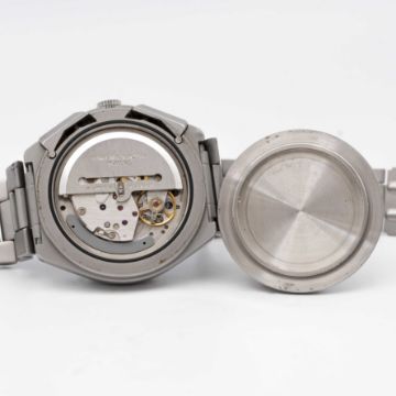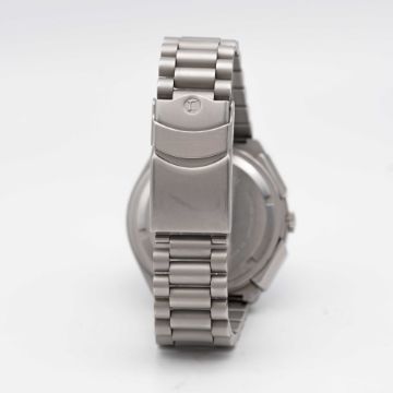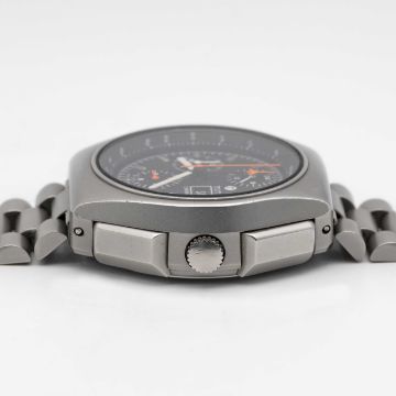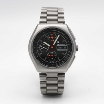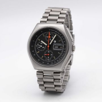 A GENTLEMAN'S STAINLESS STEEL MILITARY TUTIMA AUTOMATIC CHRONOGRAPH BRACELET WATCH CIRCA 1980s Movement: 17J, automatic, cal. 5100, signed Lemania Watch Ltd, numbered.Case: Width approx. 43mm, matt finish, screw back, signed Tutima W-Germany, numbered 9,4xx,xxx, integrated pushers and screw-down crown.Bracelet: Original matt stainless steel bracelet. CONDITION REPORTDial: Original dial in excellent condition. Movement: Running & functioning at present, timekeeping and accuracy cannot be guaranteed. Case: In very good condition, with some light scratches due to general use. Bracelet: In very good condition, with some scratches due to general use.