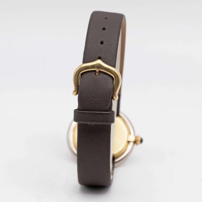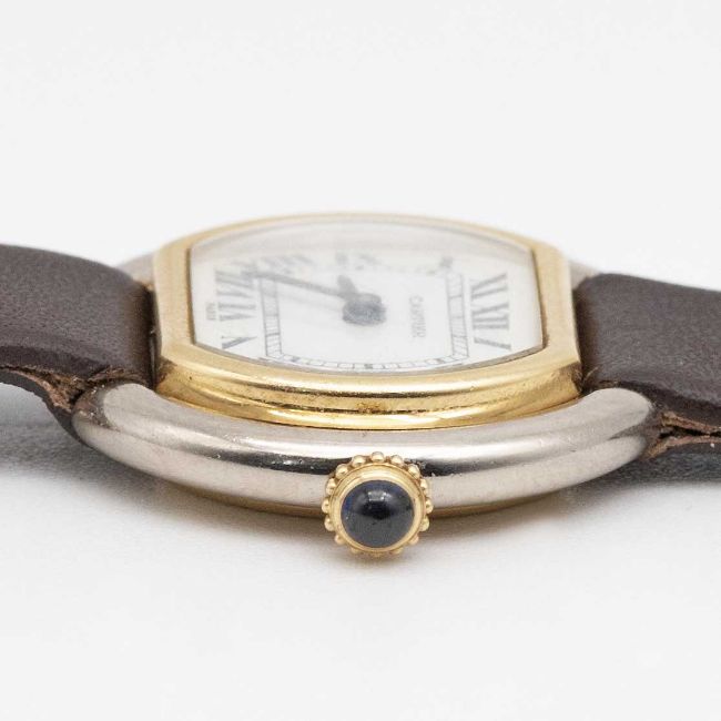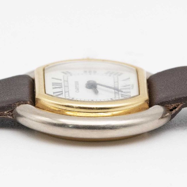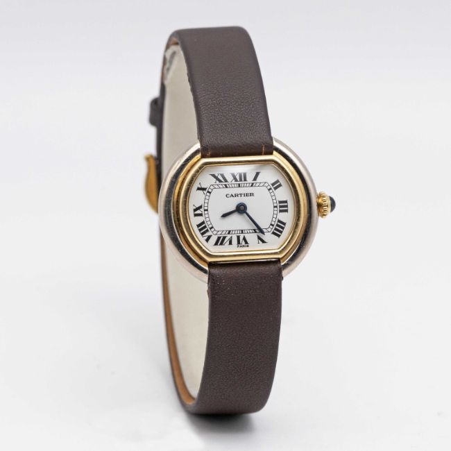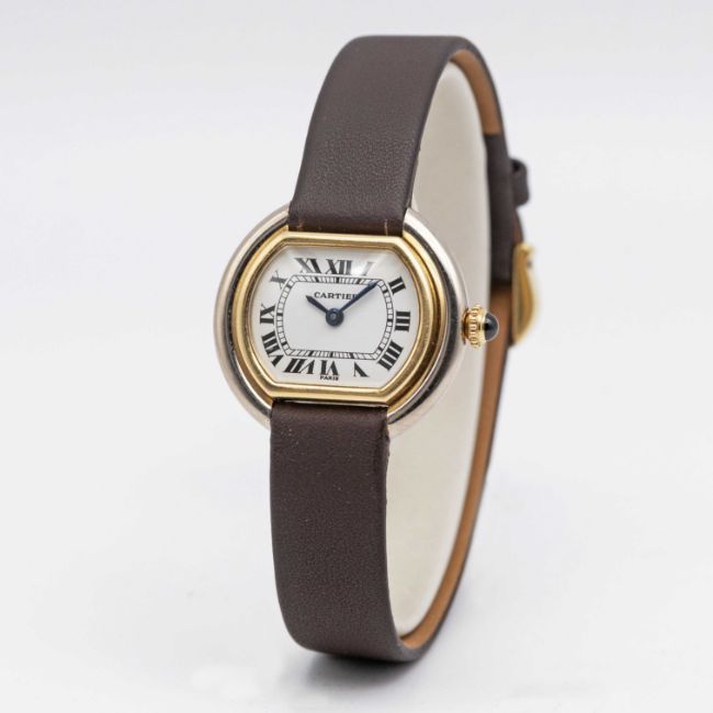 A LADIES 18K YELLOW & WHITE GOLD CARTIER PARIS ELLIPSE WRIST WATCHCIRCA 1970s, REF. 6711Movement: Manual wind, signed Cartier.Case: Width approx. 26.5mm, signed Cartier Paris, numbered, 18K hallmarks, sapphire crown.Strap: Leather strap with gold plated Cartier pin buckle.CONDITION REPORTDial: Original dial in good condition, with some crazing due to age.Movement: Running & functioning at present, timekeeping and accuracy cannot be guaranteed.Case: In very good condition, with scratches due to general use.Strap/Bracelet: In excellent condition with some light wear to the pin buckle.